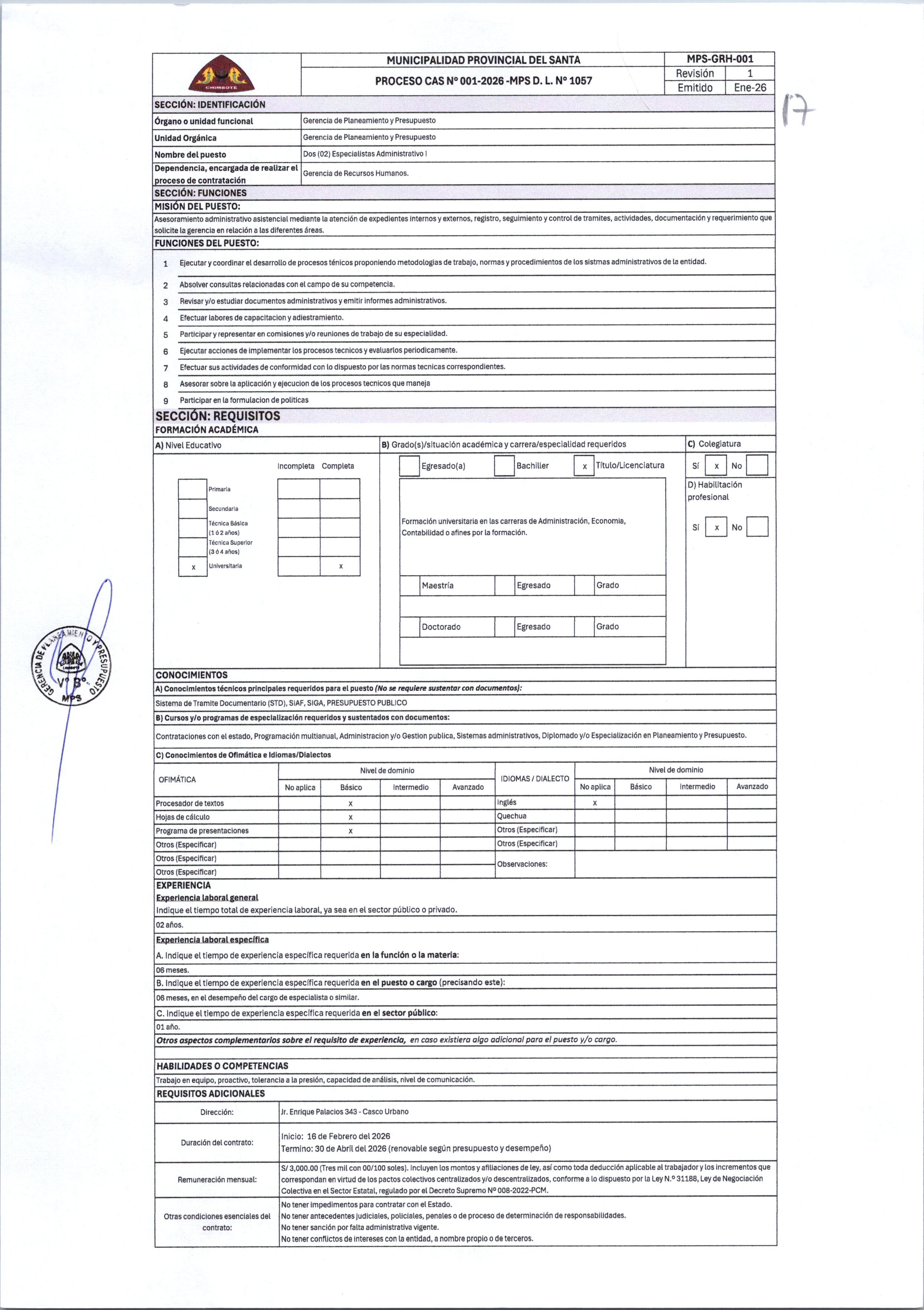 | 20 | PROCESO CAS N° 001-2026-MPS ESPECIALISTA EN PRESUPUESTO PUBLICO II |