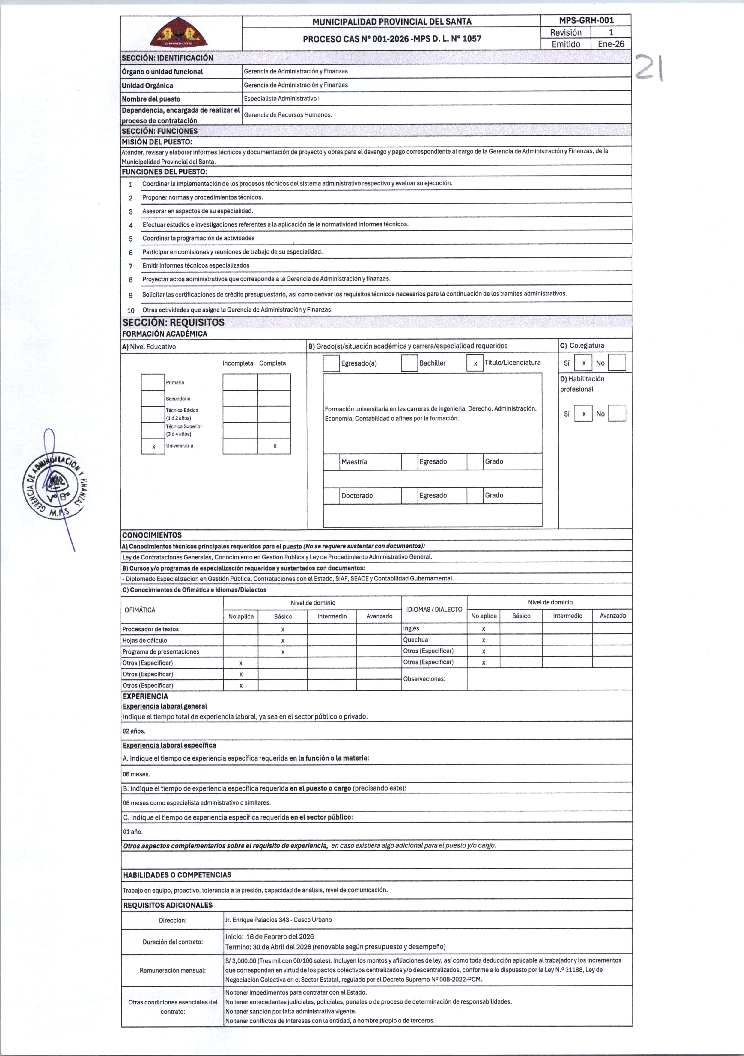 | 21 | PROCESO CAS N° 001-2026-MPS ESPECIALISTA ADMINISTRATIVO I |