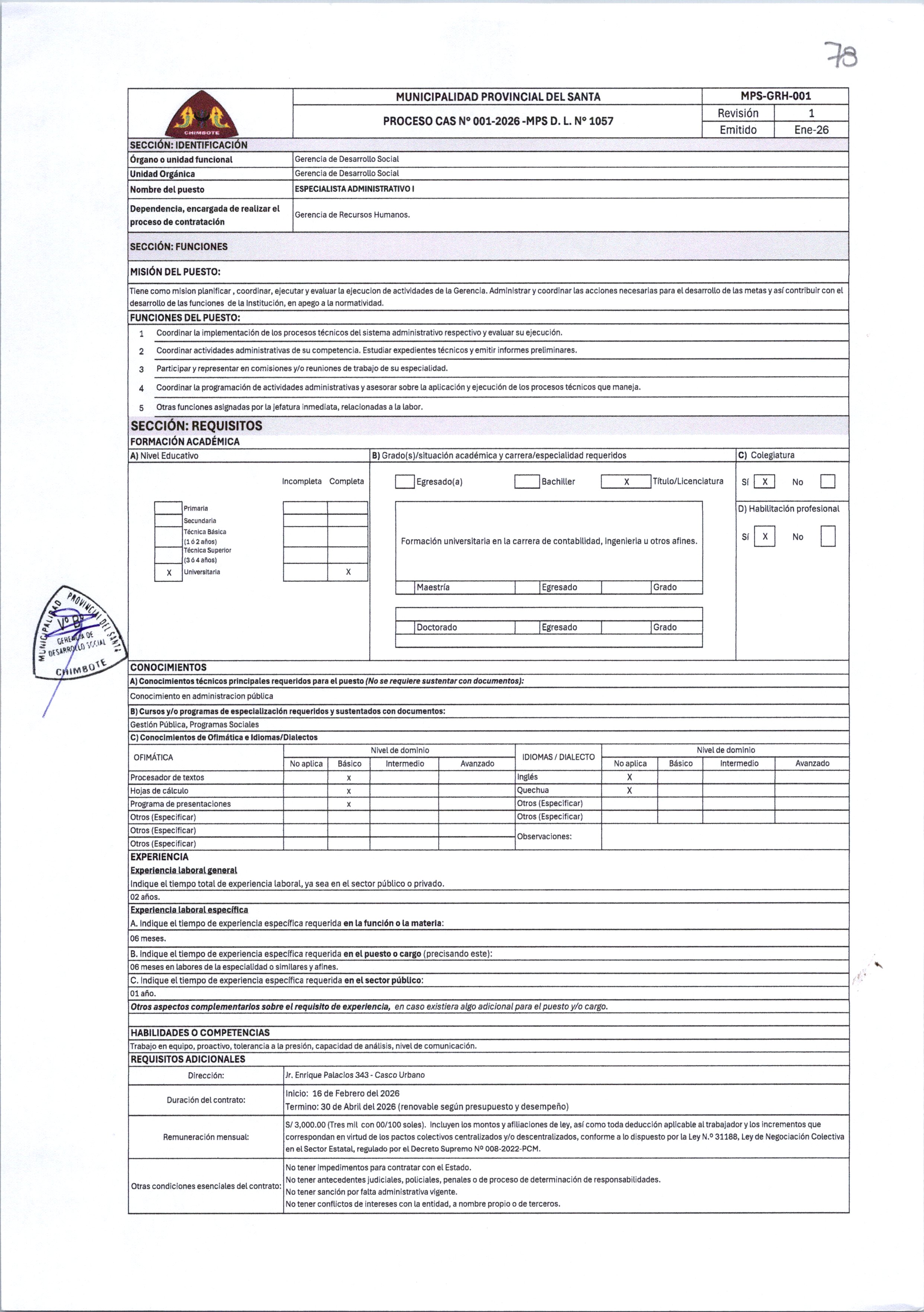 | 78 | PROCESO CAS N° 001-2026-MPS ESPECIALISTA ADMINISTRATIVO I |