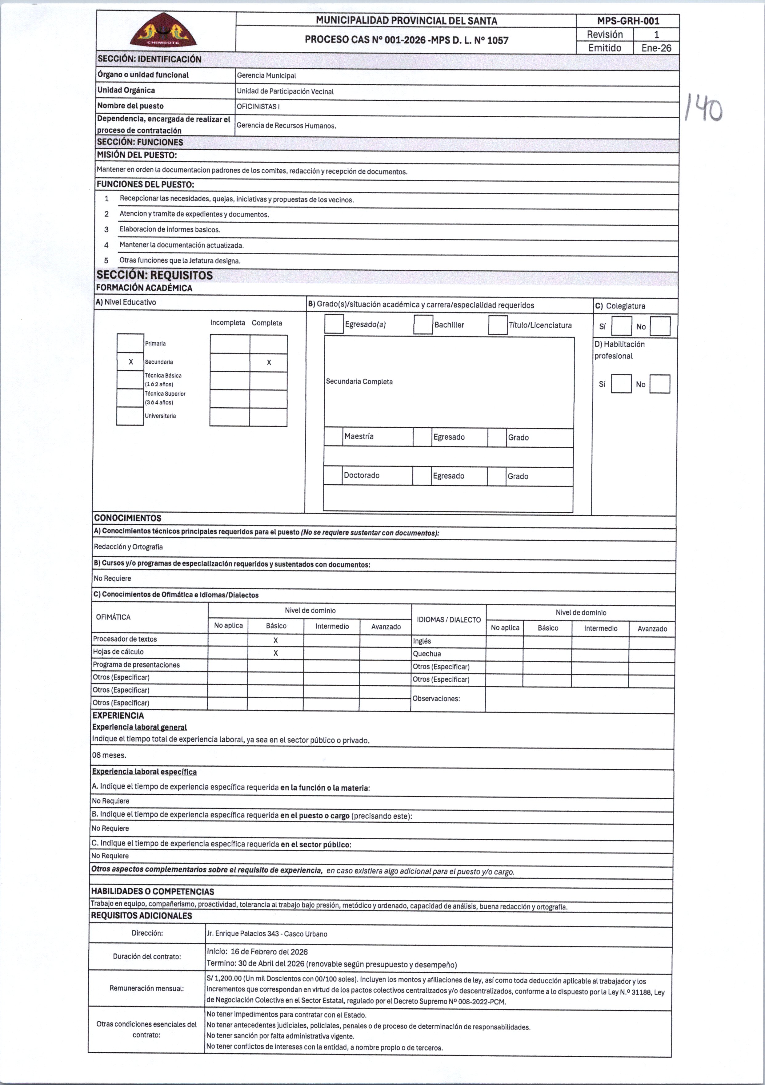 | 140 | PROCESO CAS N° 001-2026-MPS OFICINISTA I |