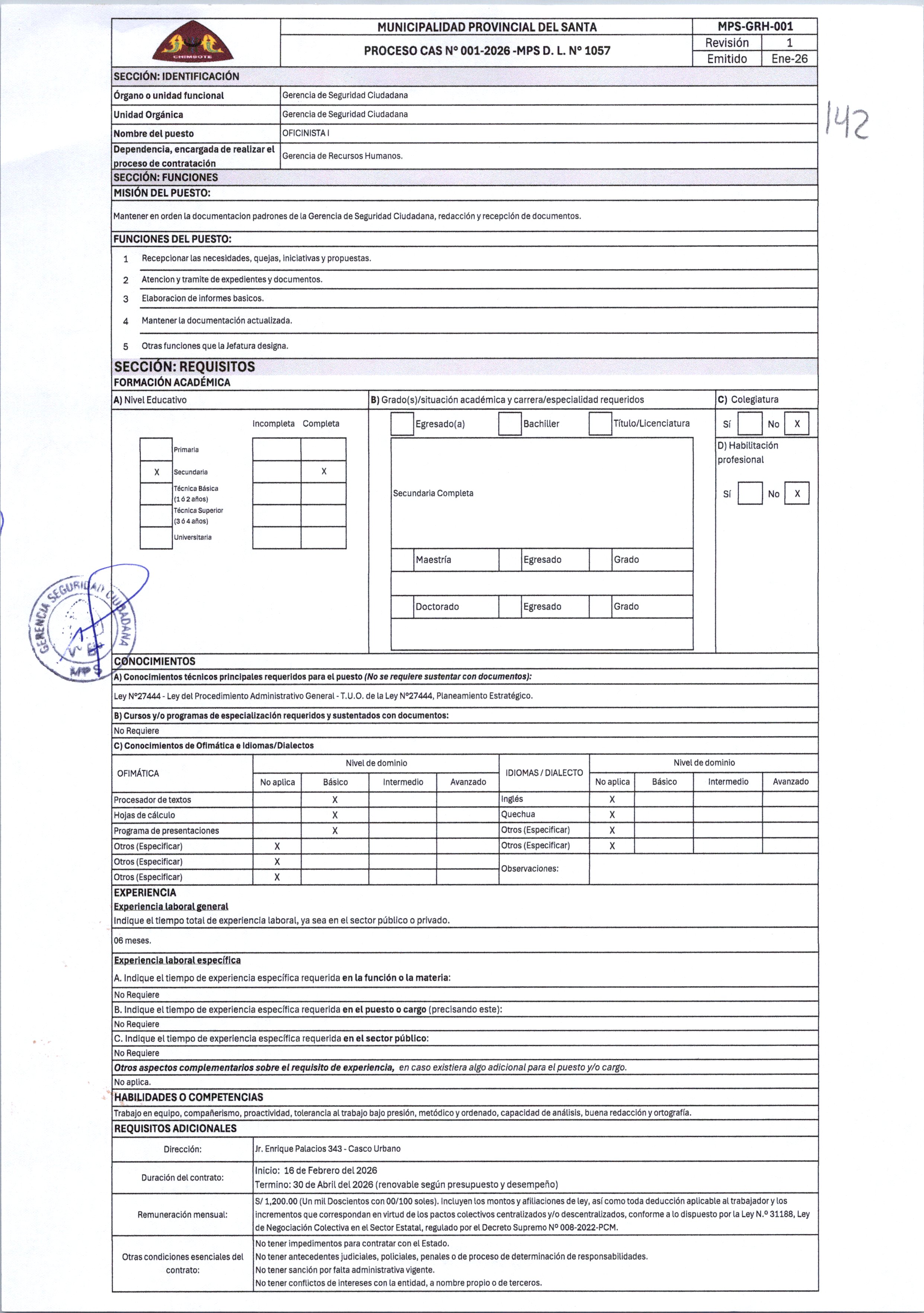 | 142 | PROCESO CAS N° 001-2026-MPS OFICINISTA I |