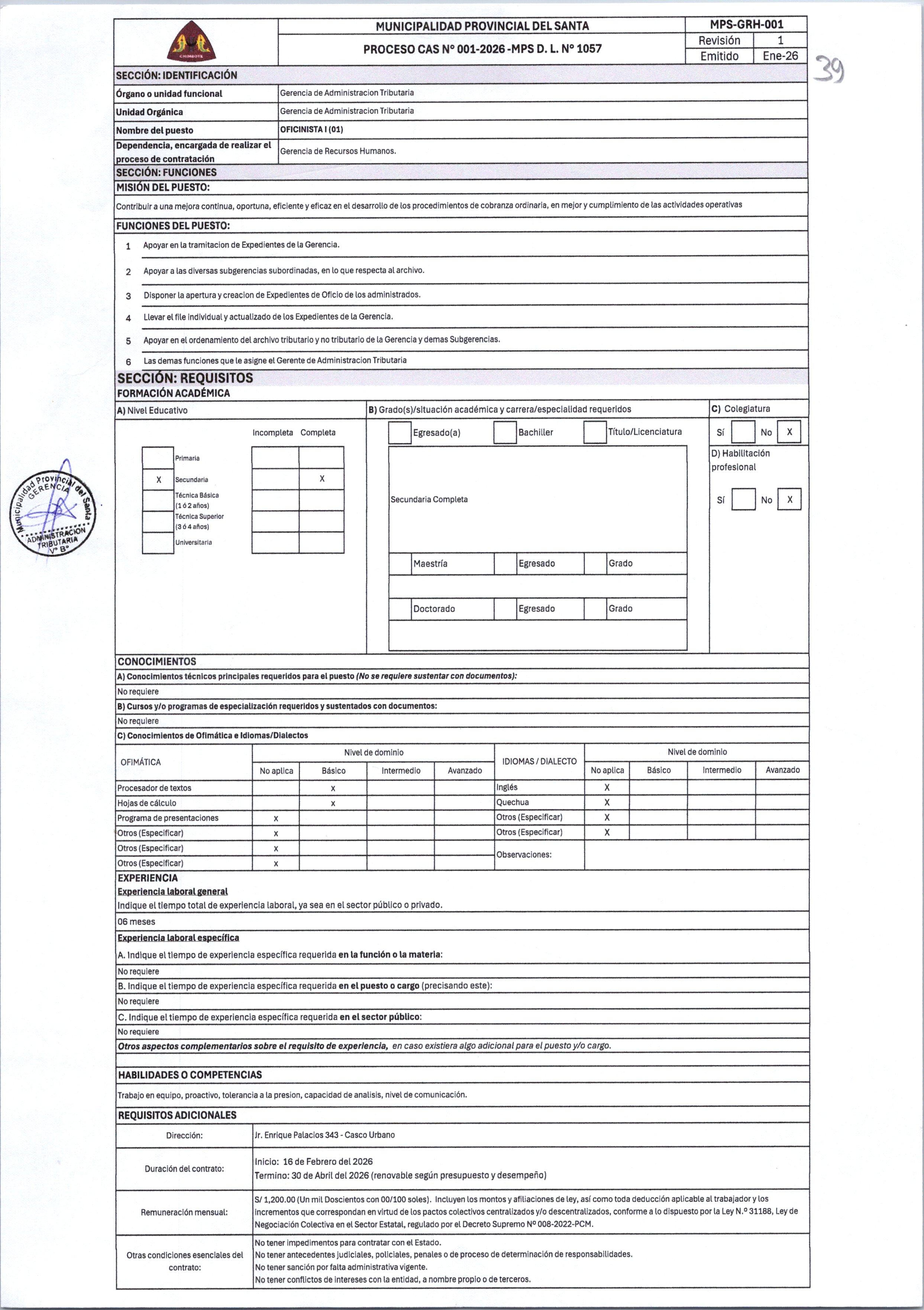 | 39 | PROCESO CAS N° 001-2026-MPS OFICINISTA I |
