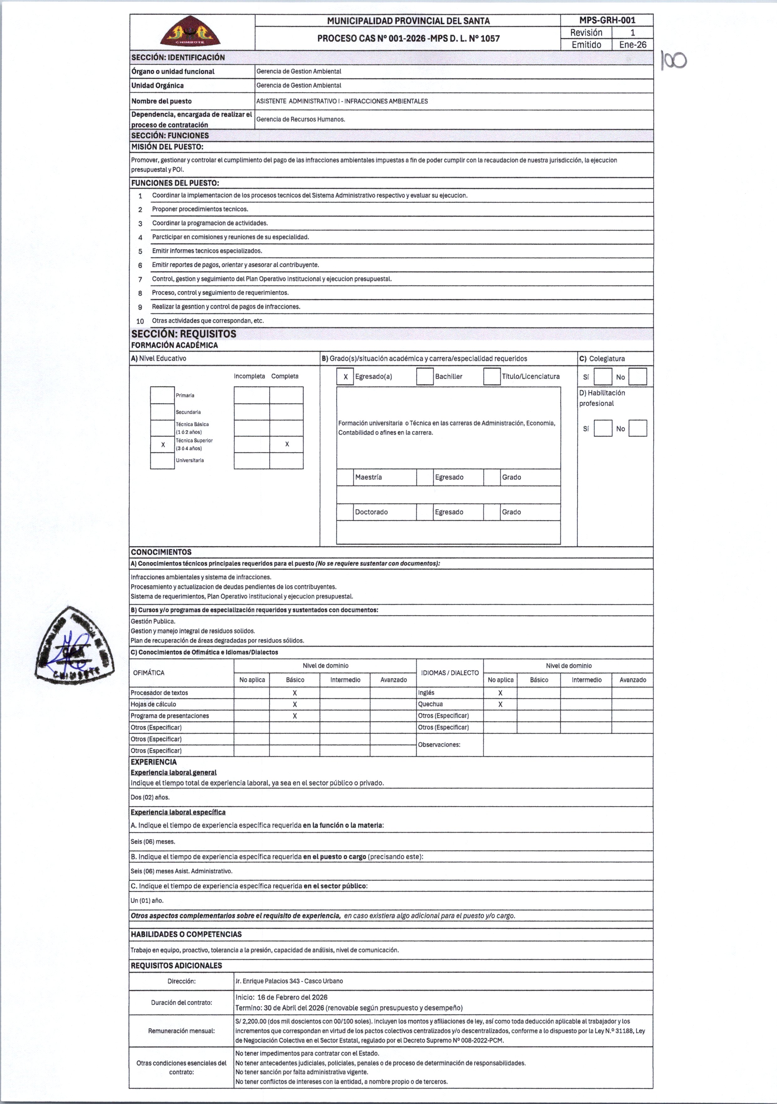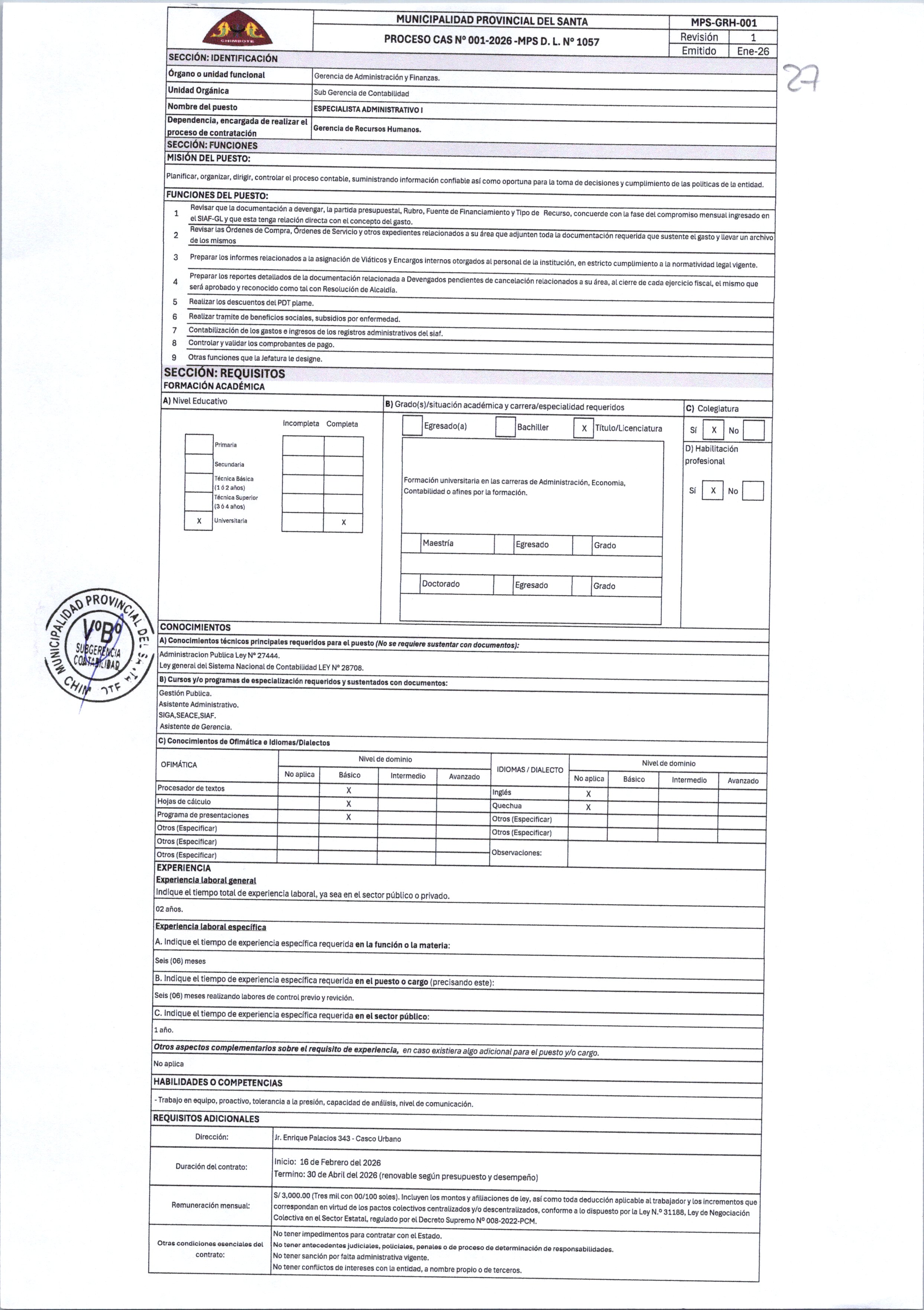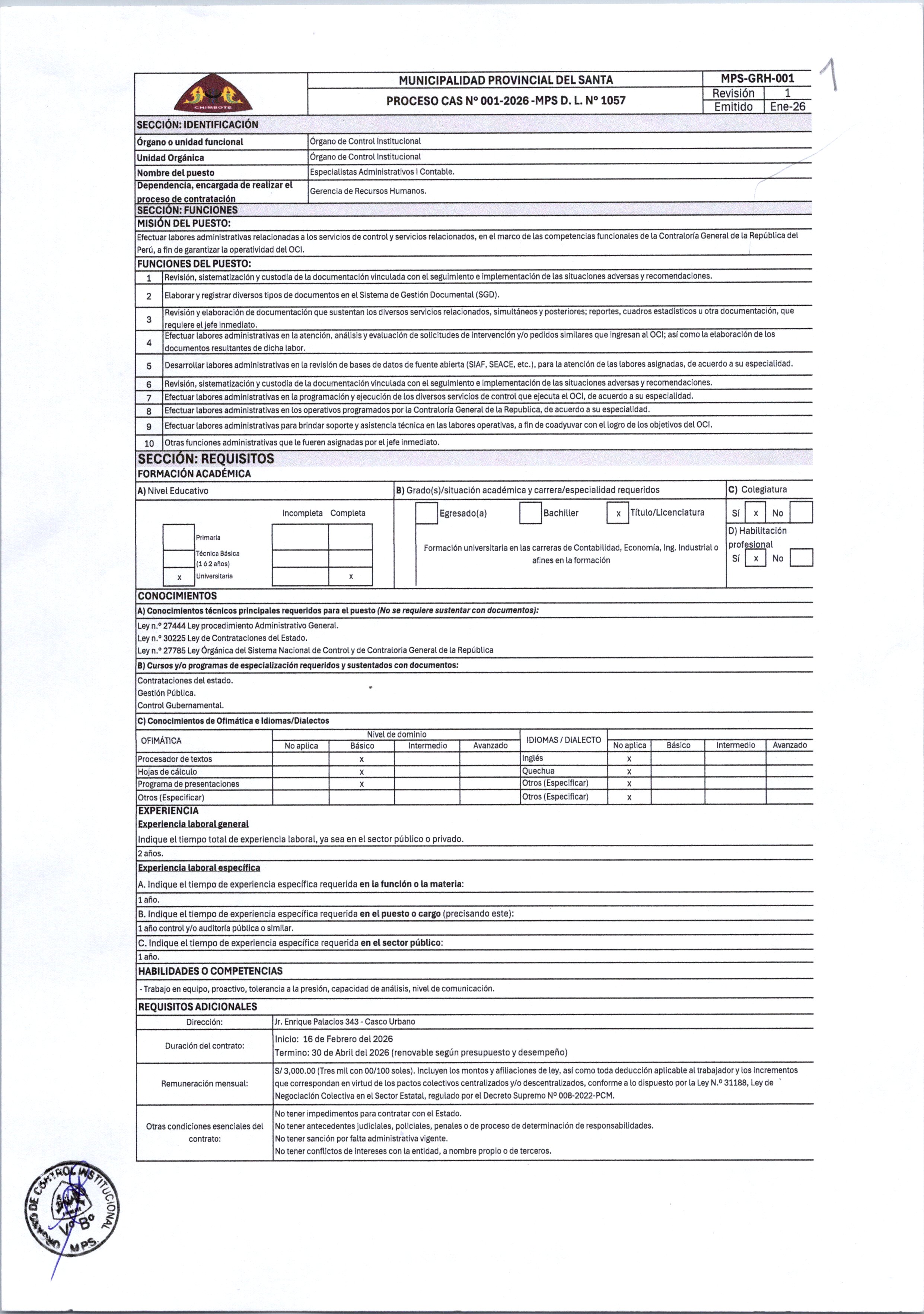 | 1 | PROCESO CAS N° 001-2026-MPS ESPECIALISTA ADMINISTRATIVO I CONTABLE |