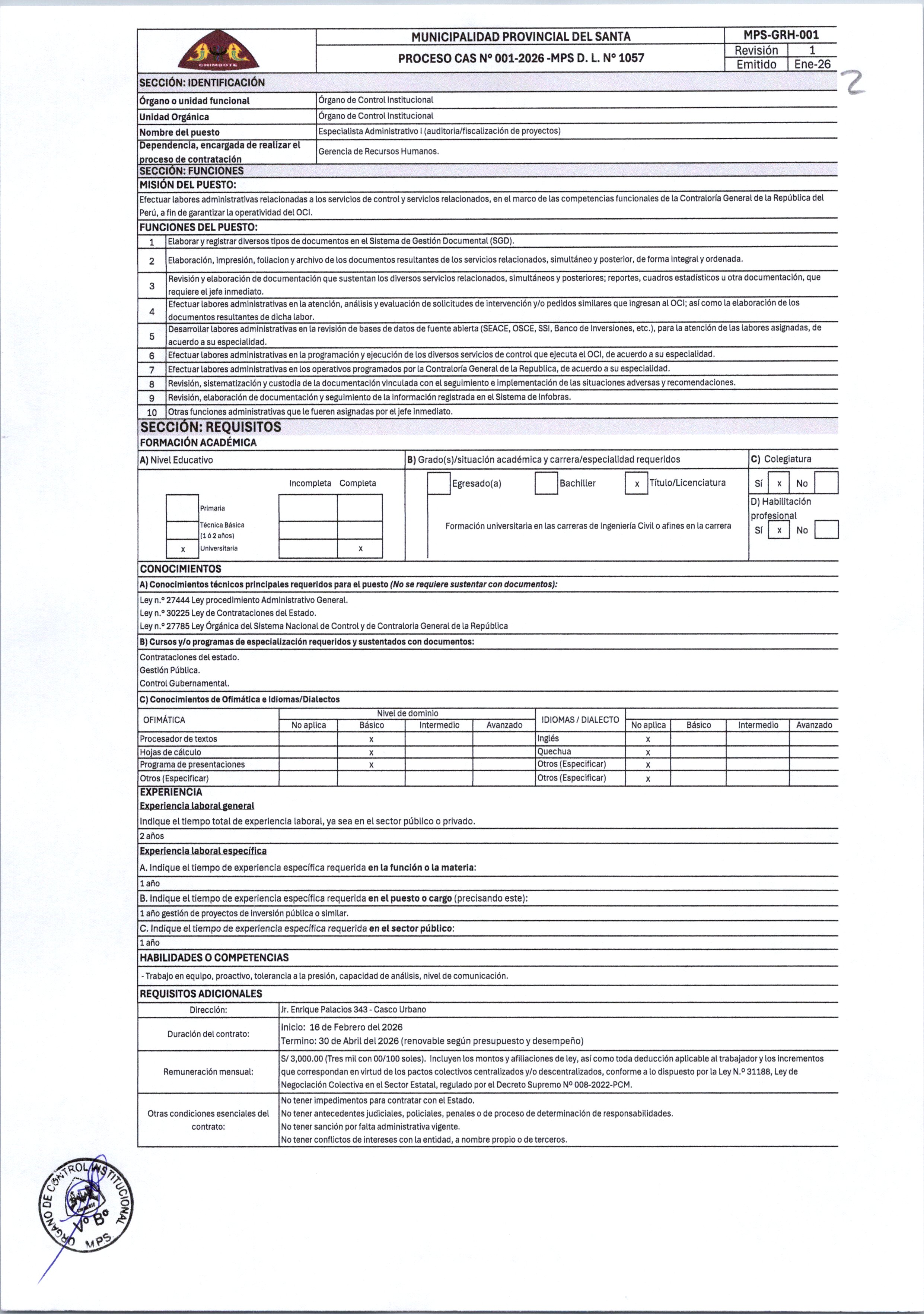 | 2 | PROCESO CAS N° 001-2026-MPS ESPECIALISTA ADMINISTRATIVO I (AUDITORIA/FISCALIZACION DE PROYECTOS) |