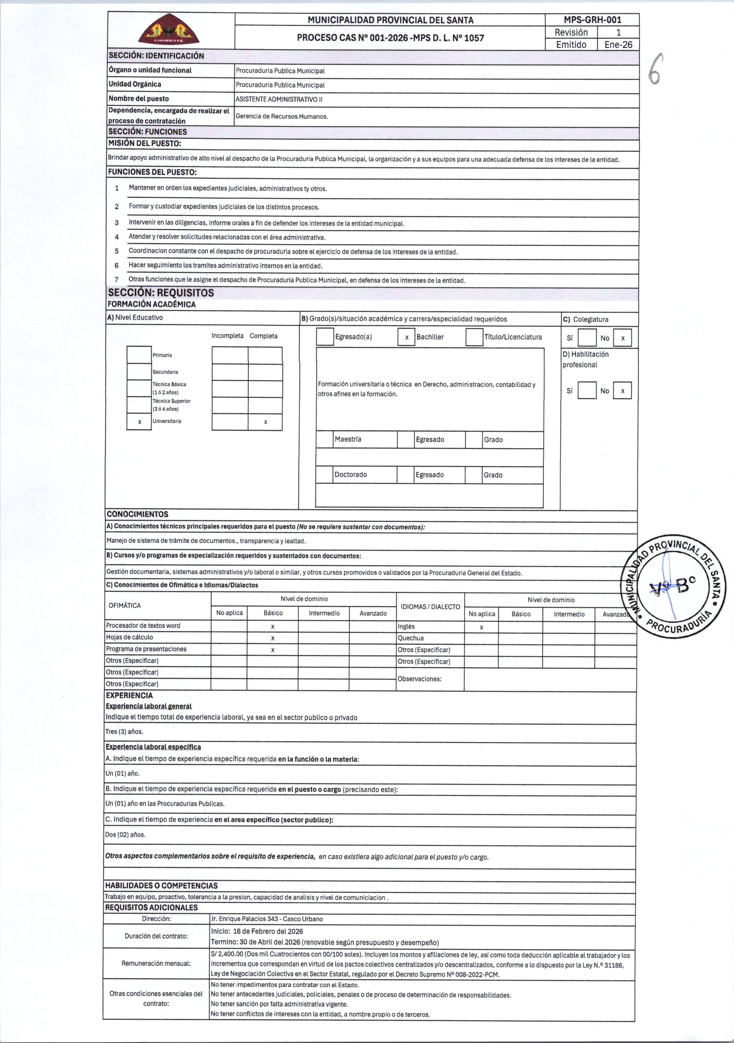| 6 | PROCESO CAS N° 001-2026-MPS ASISTENTE ADMINISTRATIVO II |