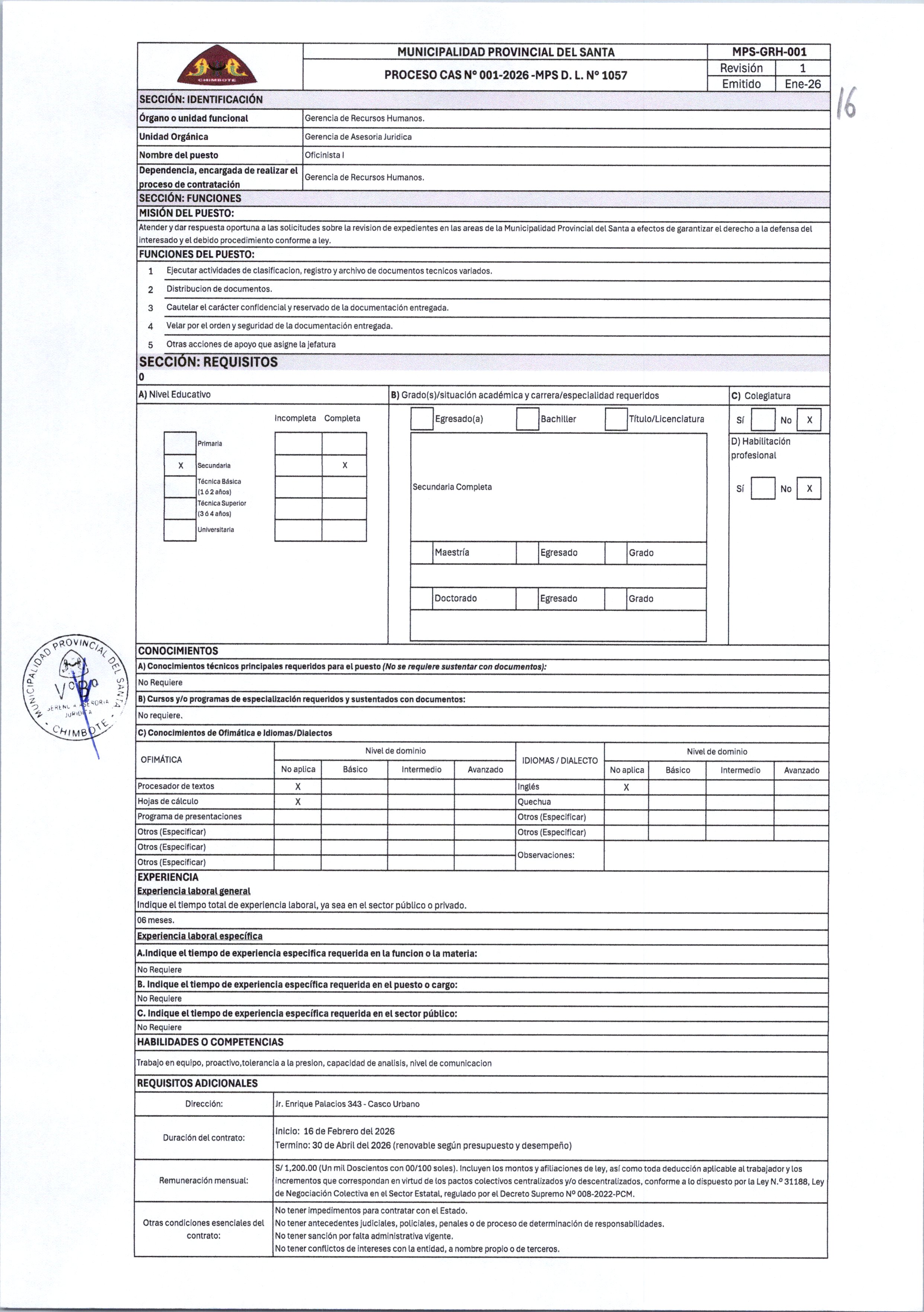| 16 | PROCESO CAS N° 001-2026-MPS OFICINISTA I |