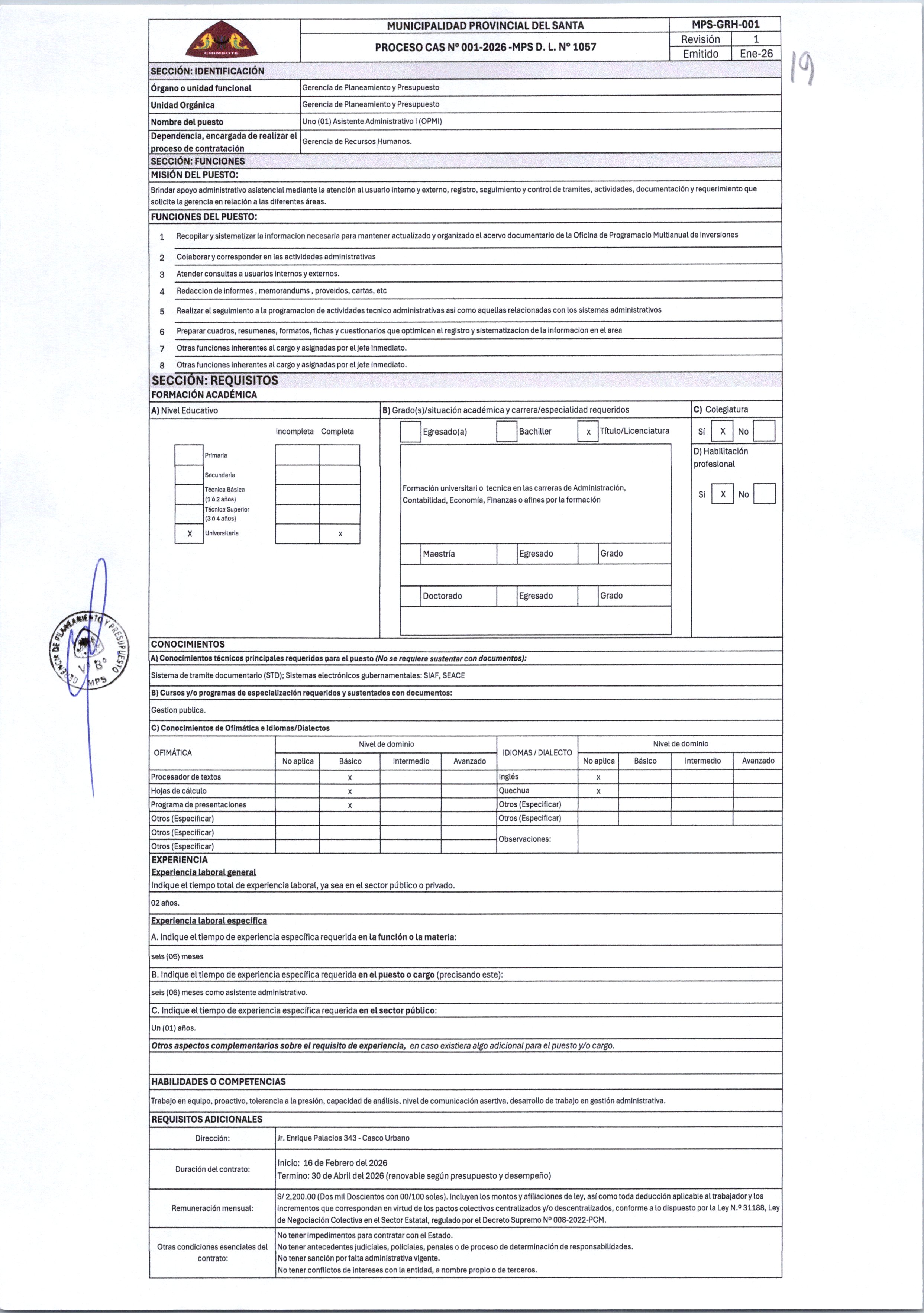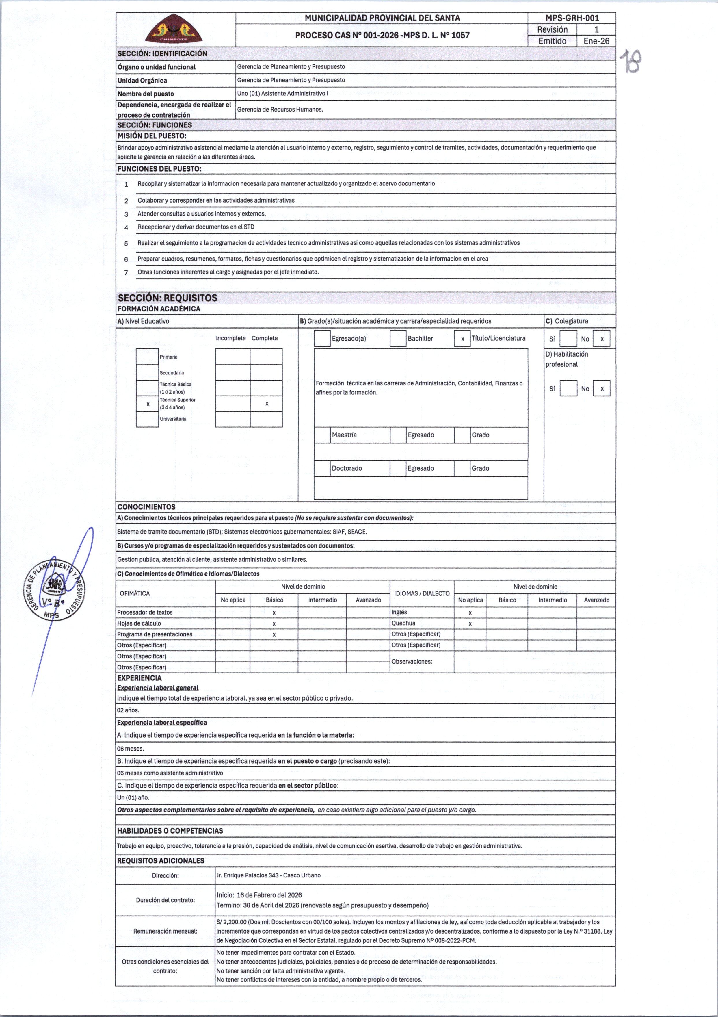 | 18 | PROCESO CAS N° 001-2026-MPS ASISTENTE ADMINISTRATIVO I |