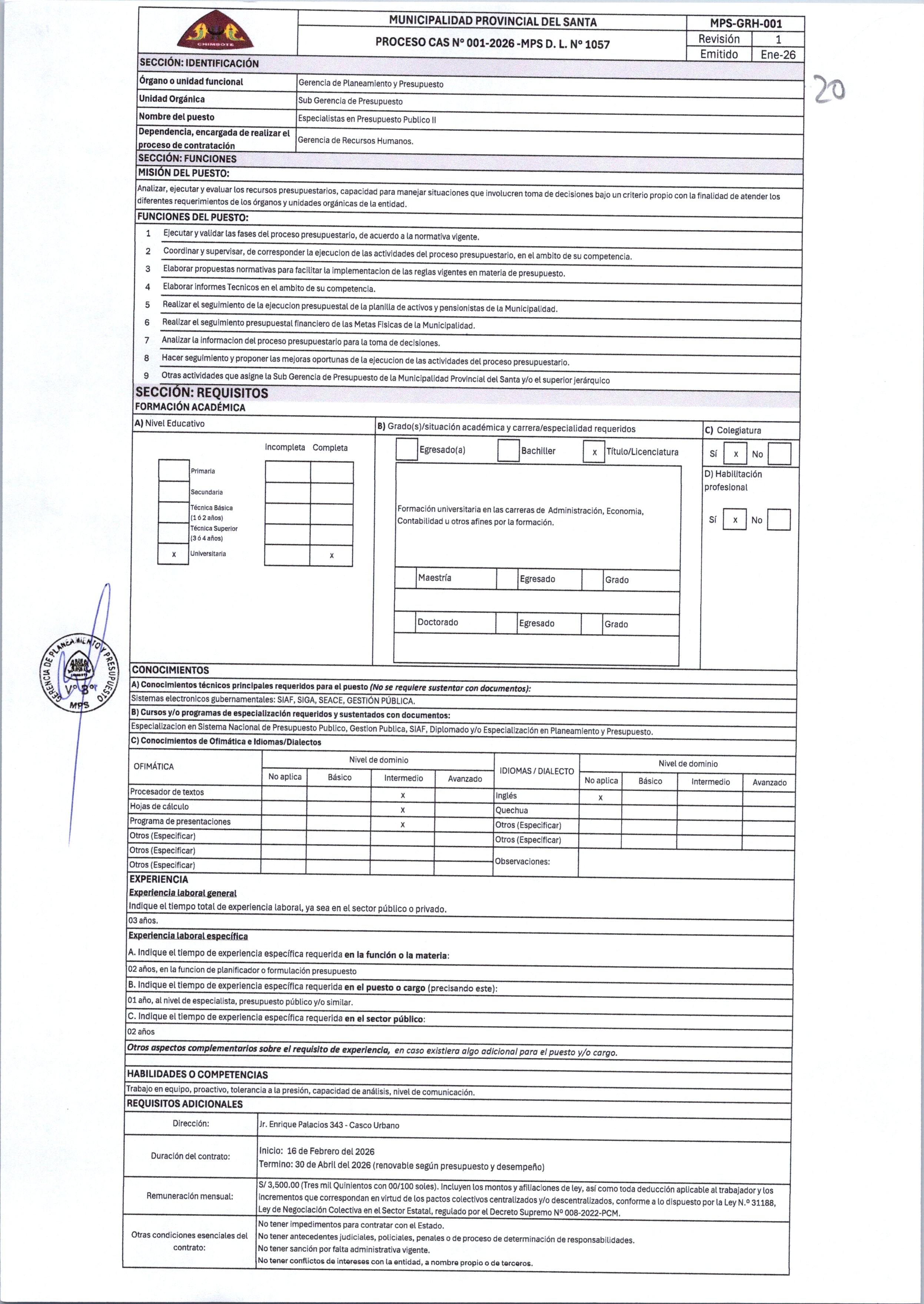 | 20 | PROCESO CAS N° 001-2026-MPS ESPECIALISTA EN PRESUPUESTO PUBLICO II |