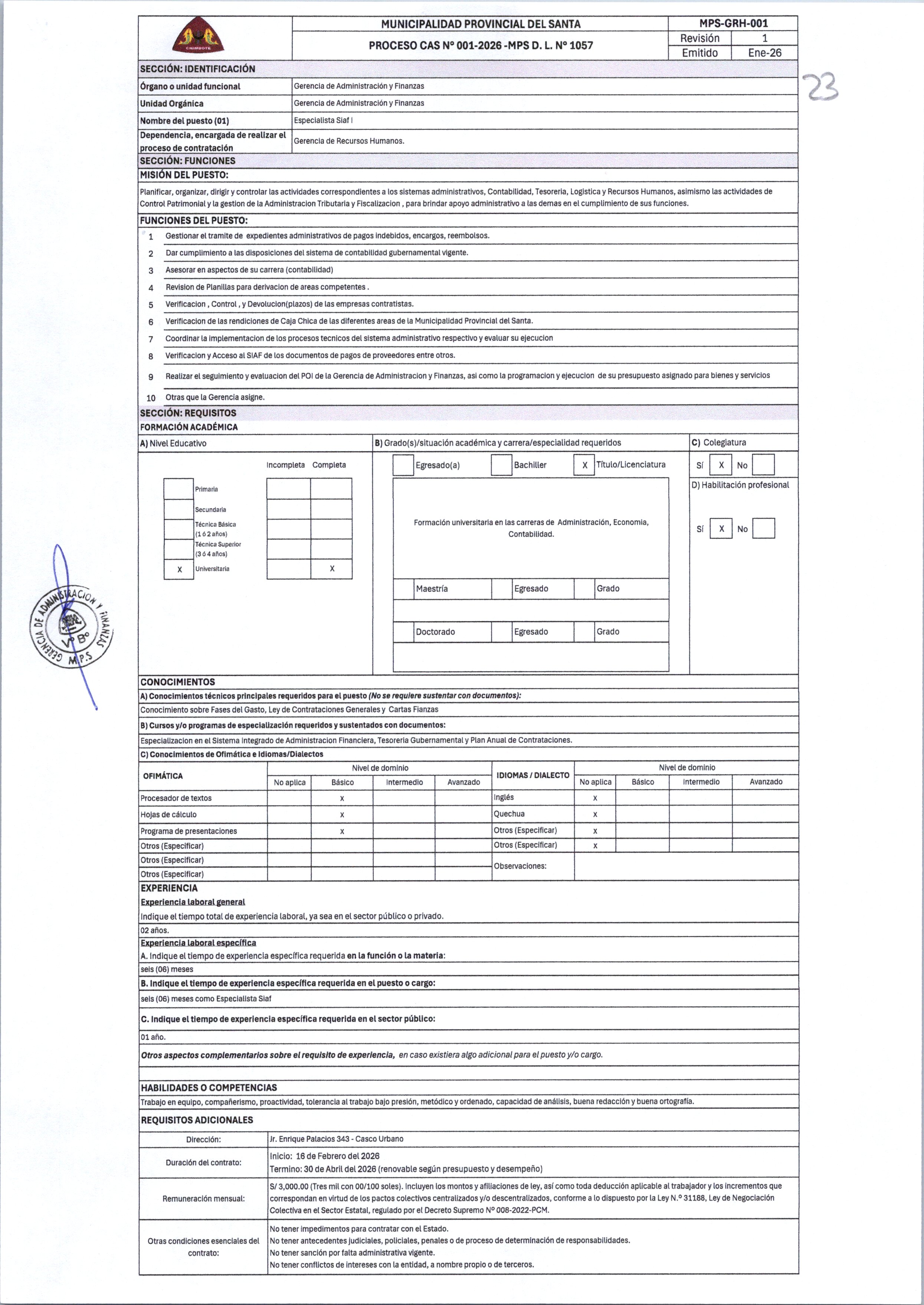 | 23 | PROCESO CAS N° 001-2026-MPS ESPECIALISTA EN SIAF I |