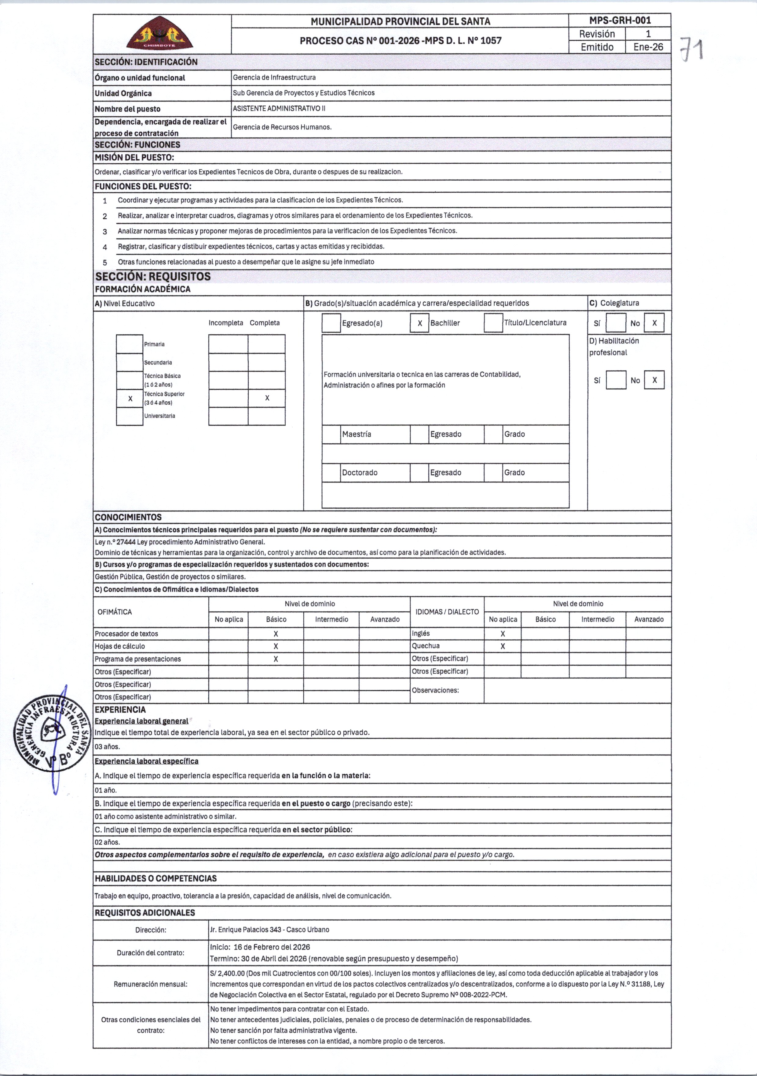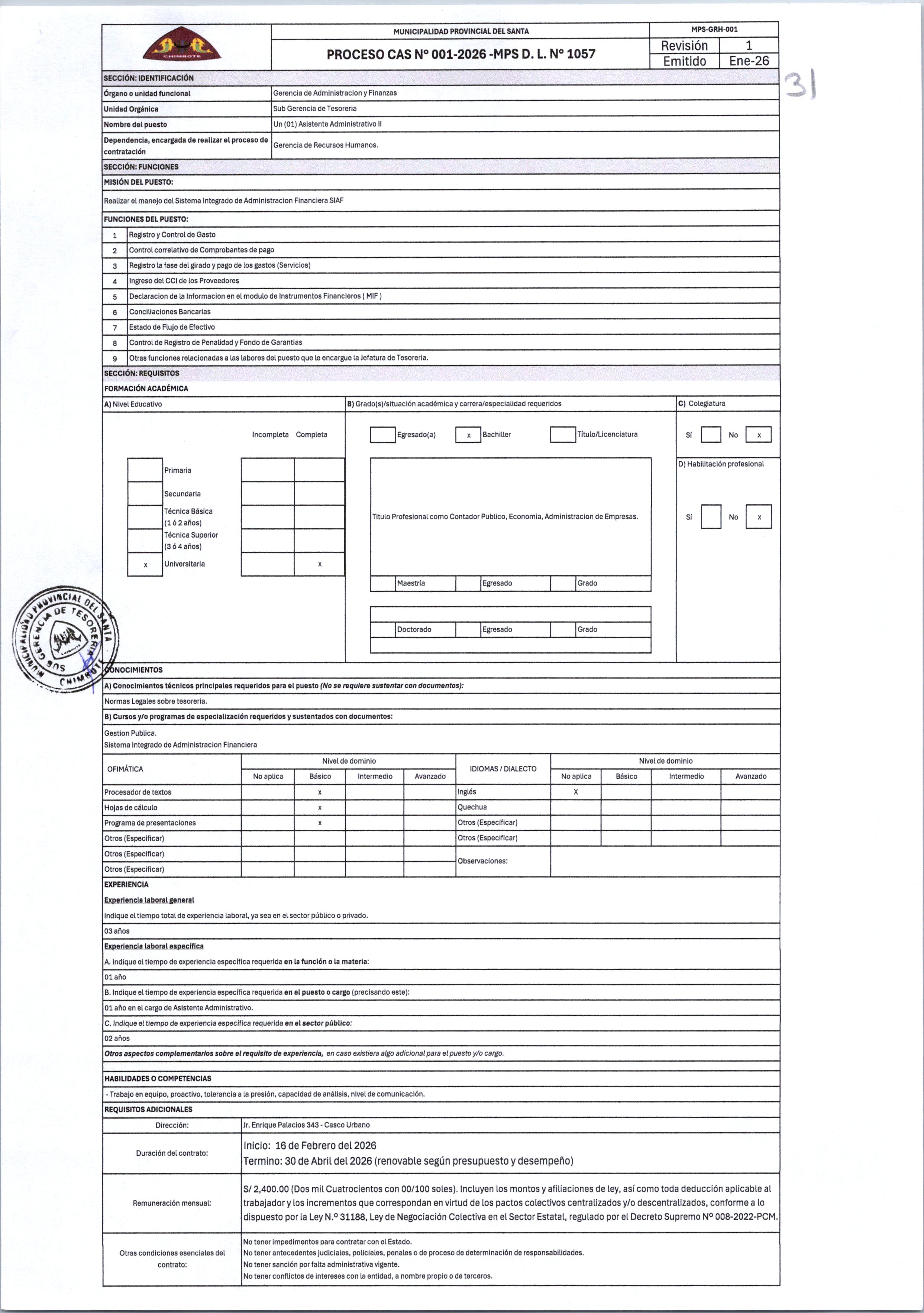 | 31 | PROCESO CAS N° 001-2026-MPS ASISTENTE ADMINISTRATIVO II |