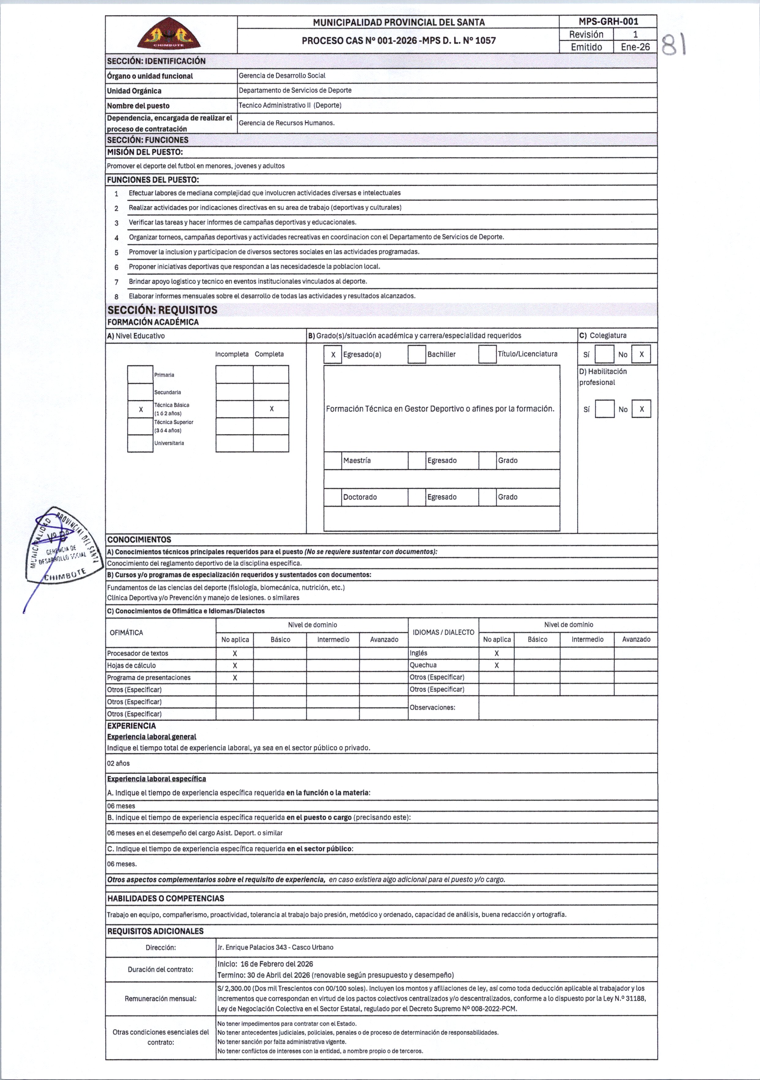 | 81 | PROCESO CAS N° 001-2026-MPS TECNICO ADMINISTRATIVO II (AREA DEPORTES) |