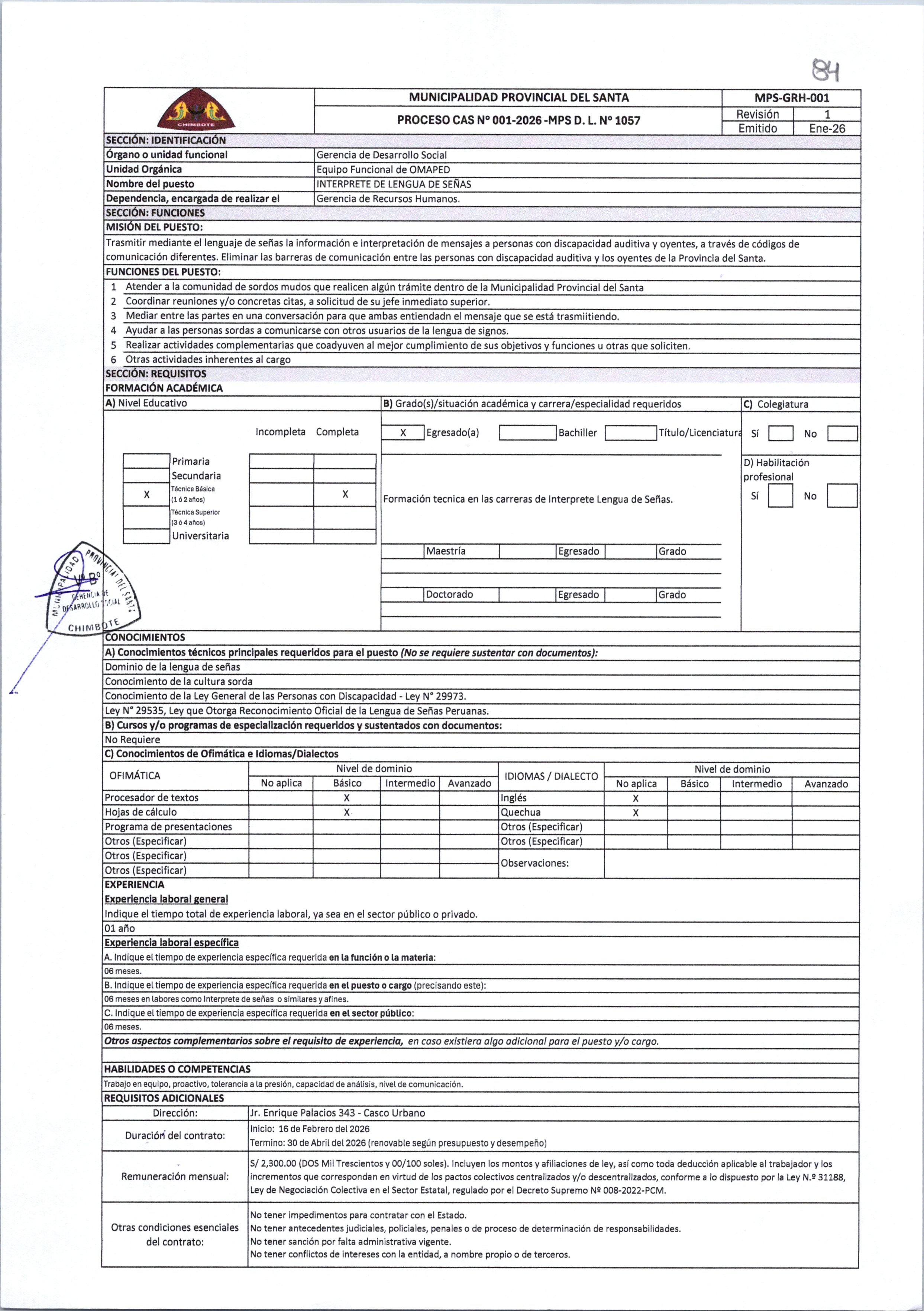 | 84 | PROCESO CAS N° 001-2026-MPS INTÉRPRETE LENGUA DE SEÑAS |