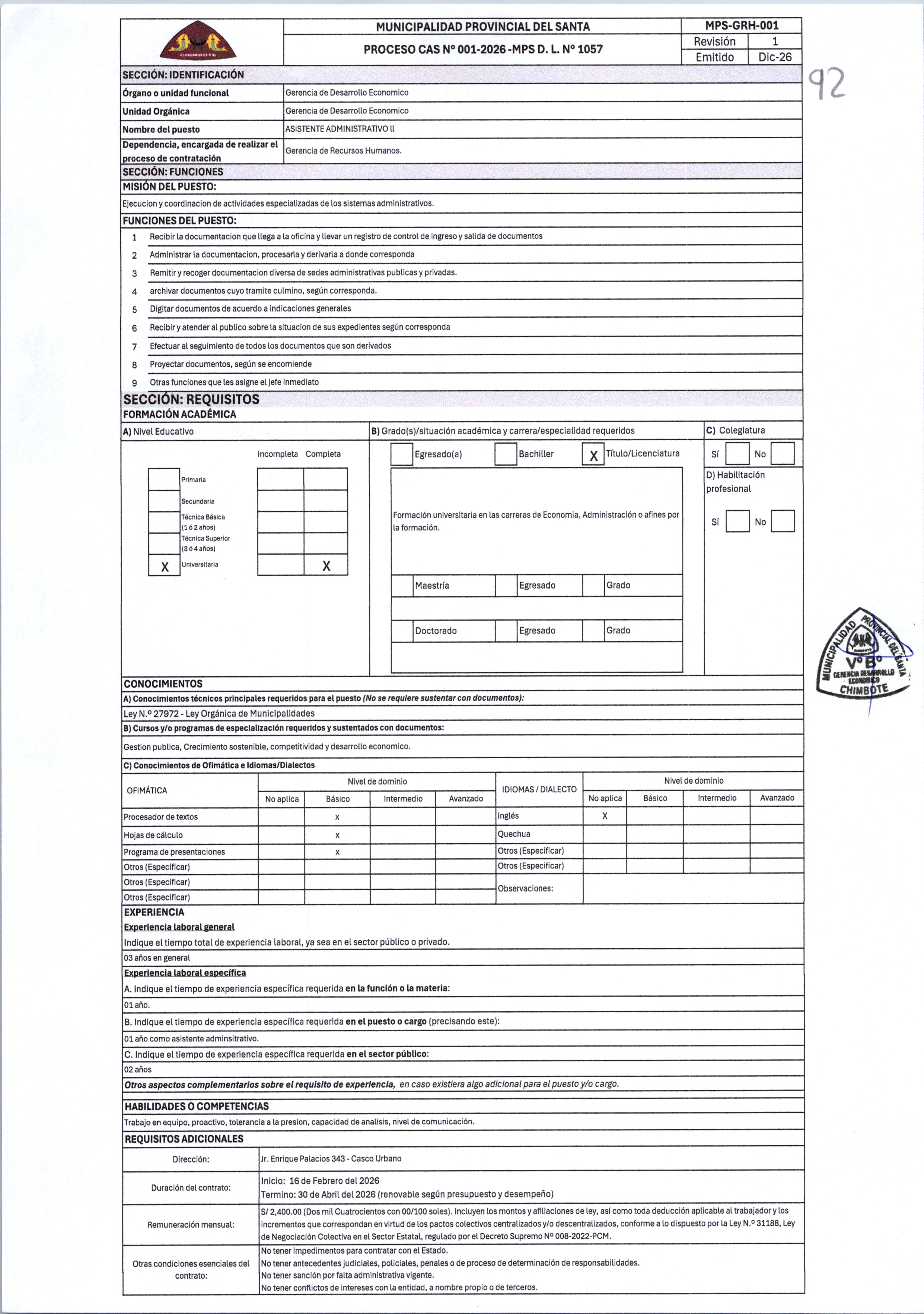 | 92 | PROCESO CAS N° 001-2026-MPS ASISTENTE ADMINISTRATIVO II |
