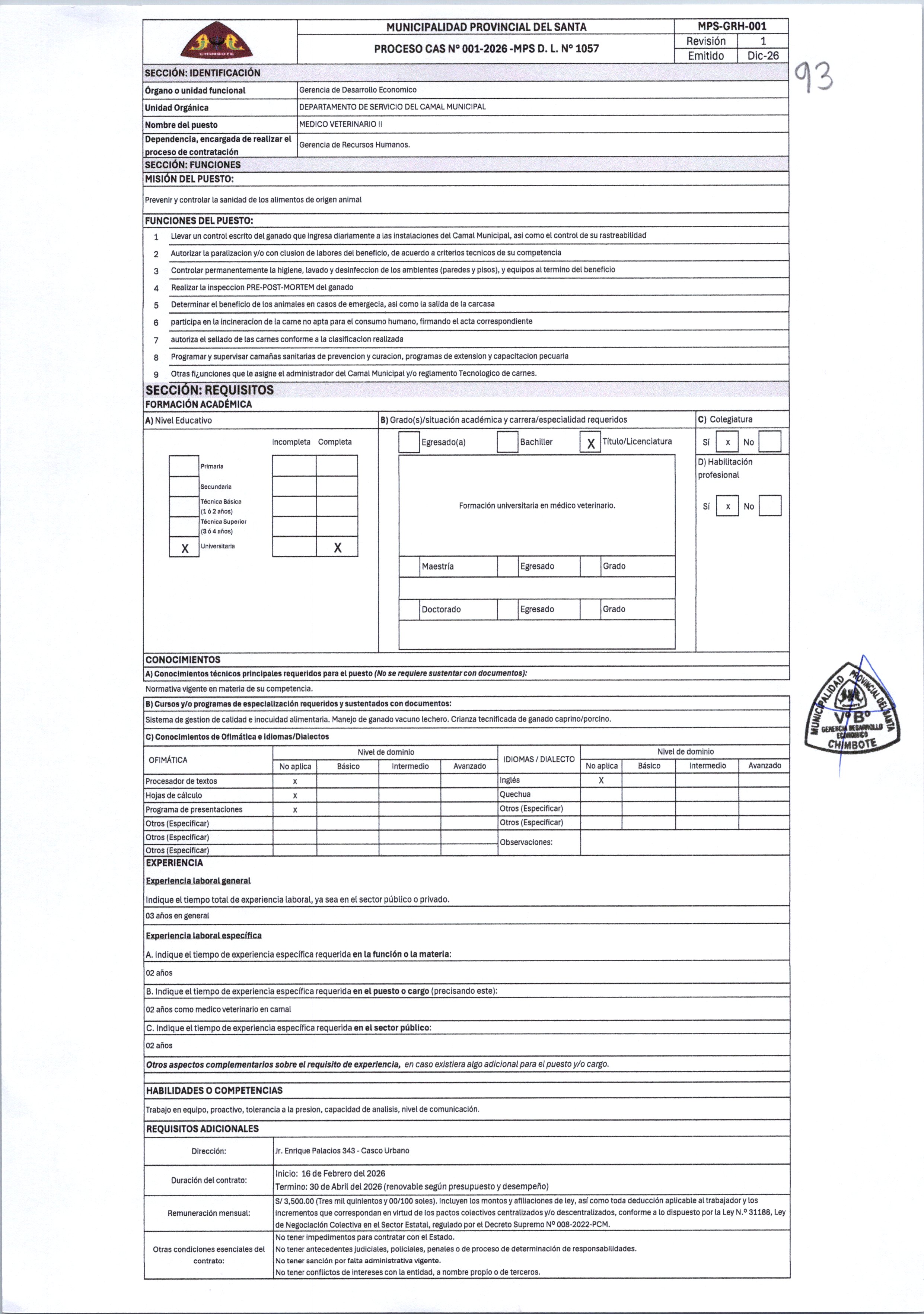 | 93 | PROCESO CAS N° 001-2026-MPS MÉDICO VETERINARIO II |