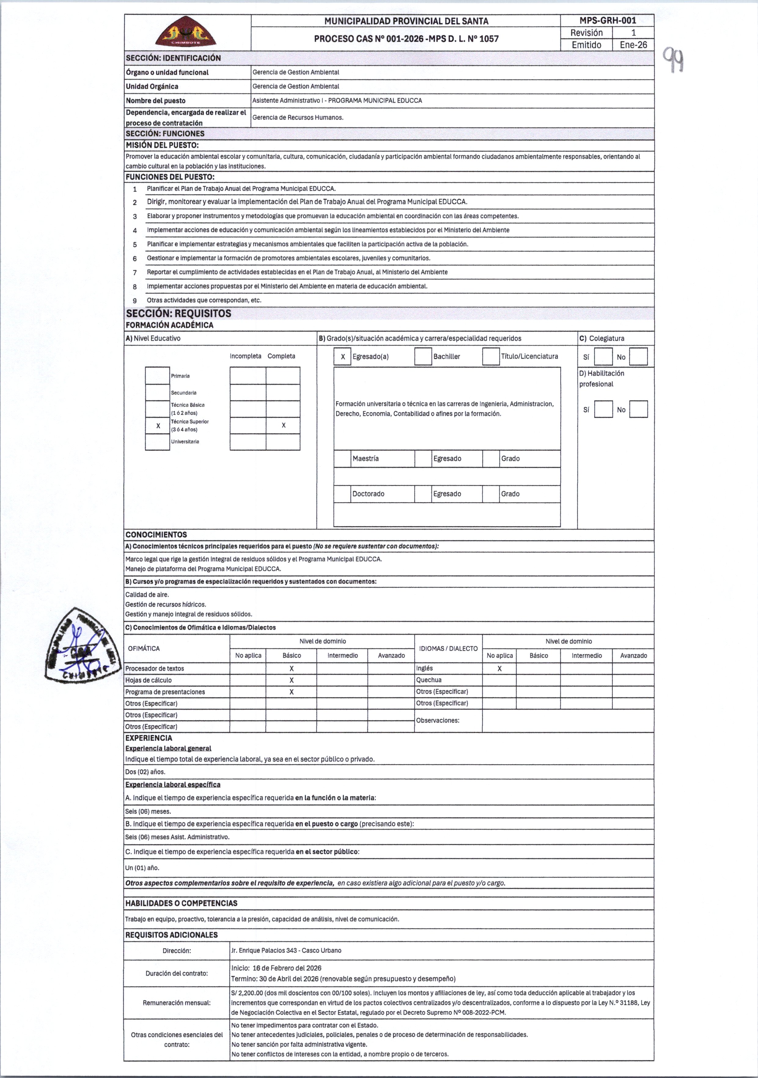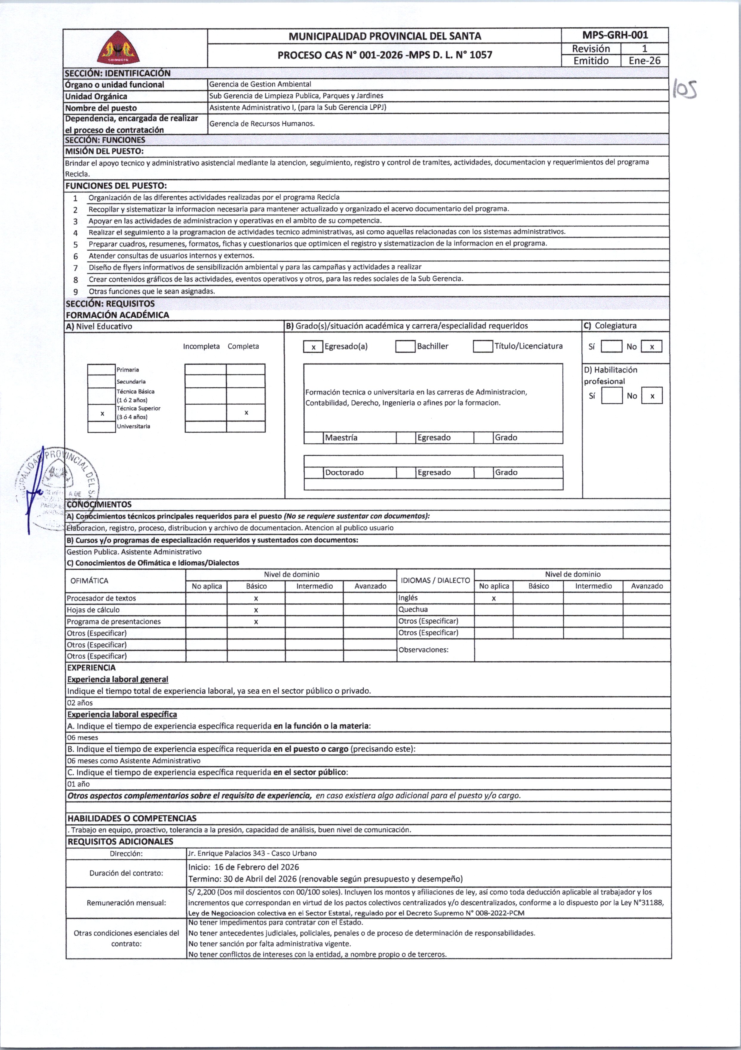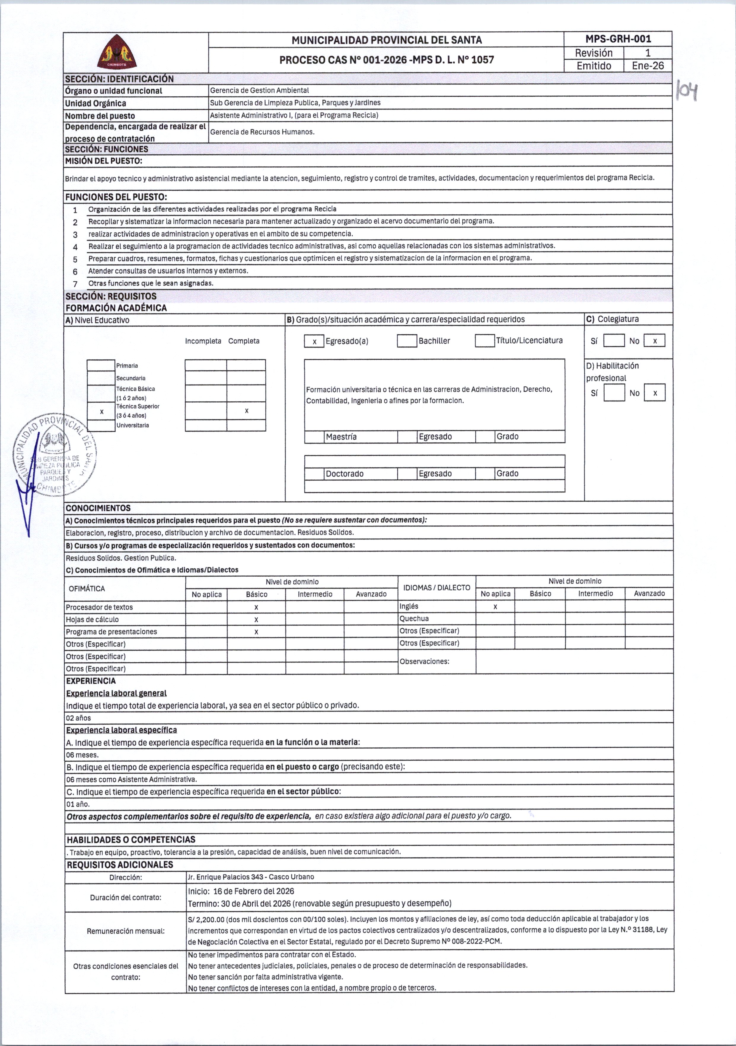 | 104 | PROCESO CAS N° 001-2026-MPS ASISTENTE ADMINISTRATIVO I (PROGRAMA RECICLA) |
