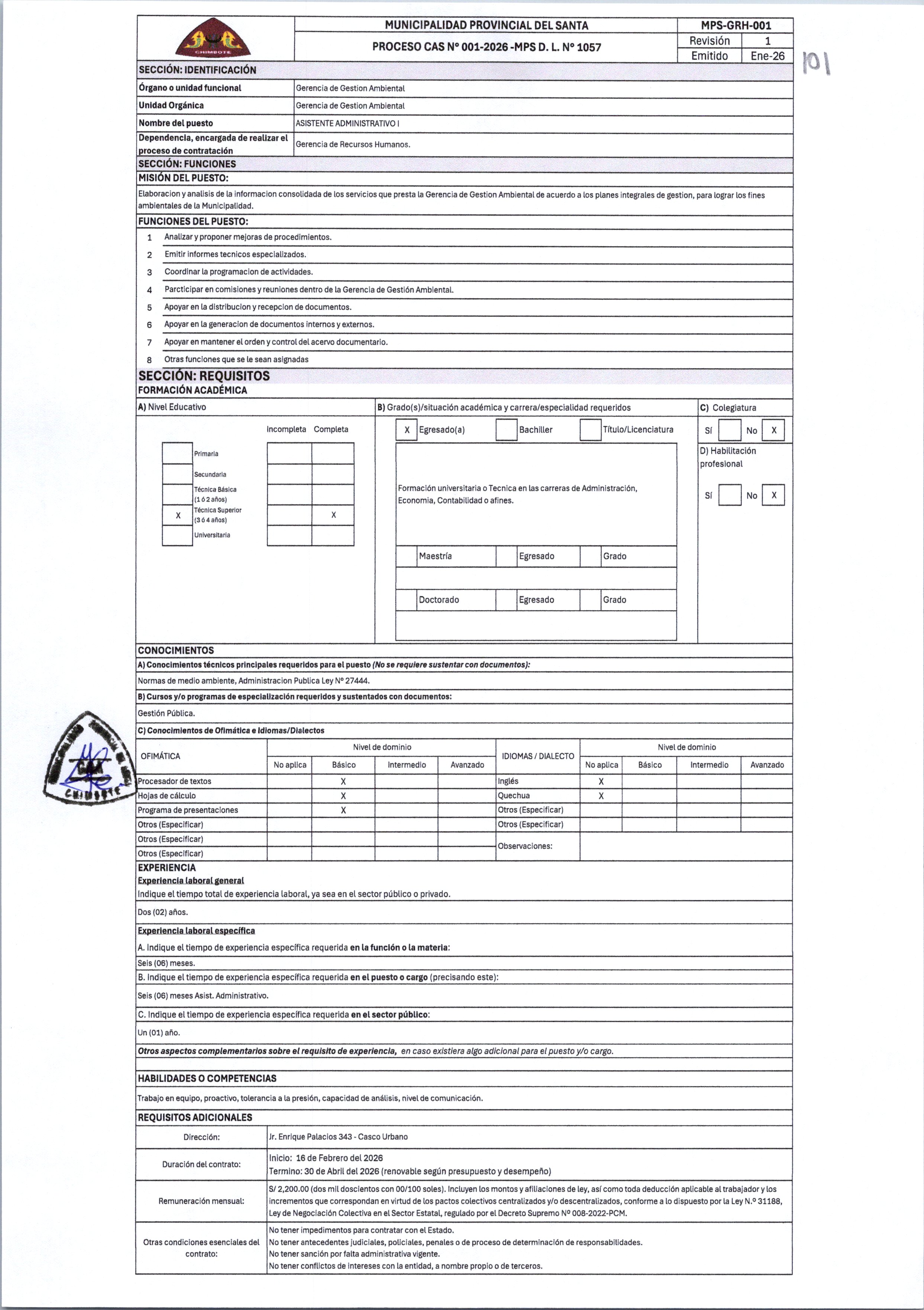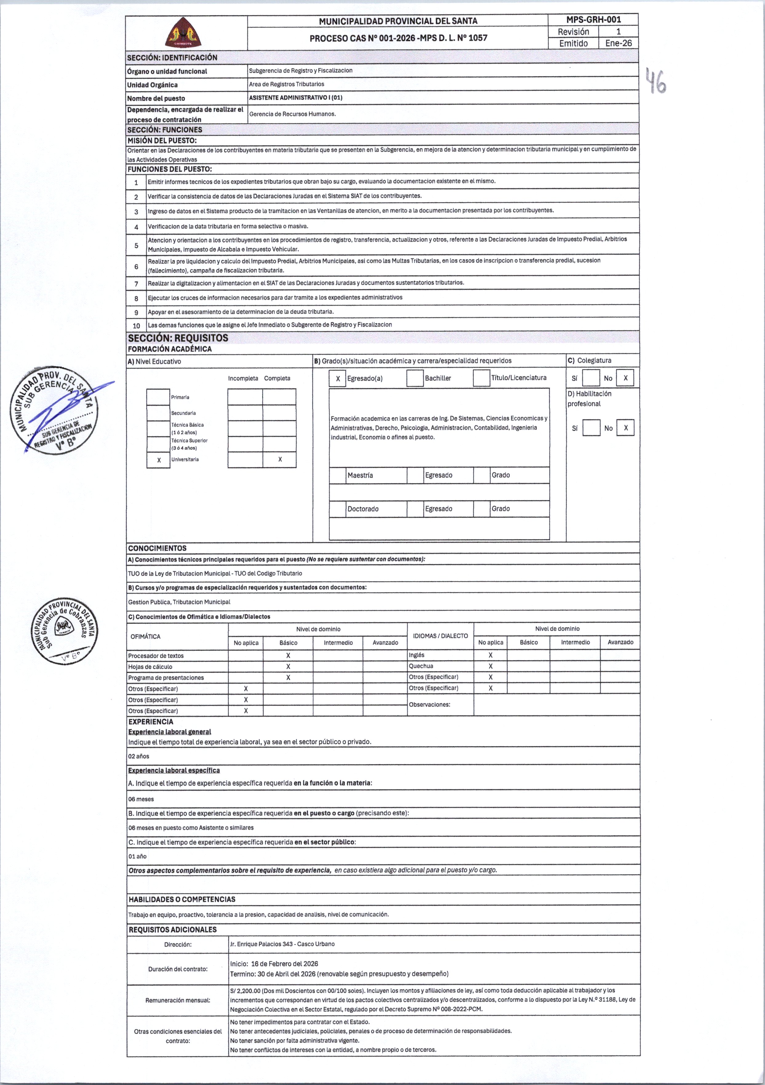 | 46 | PROCESO CAS N° 001-2026-MPS ASISTENTE ADMINISTRATIVO I |