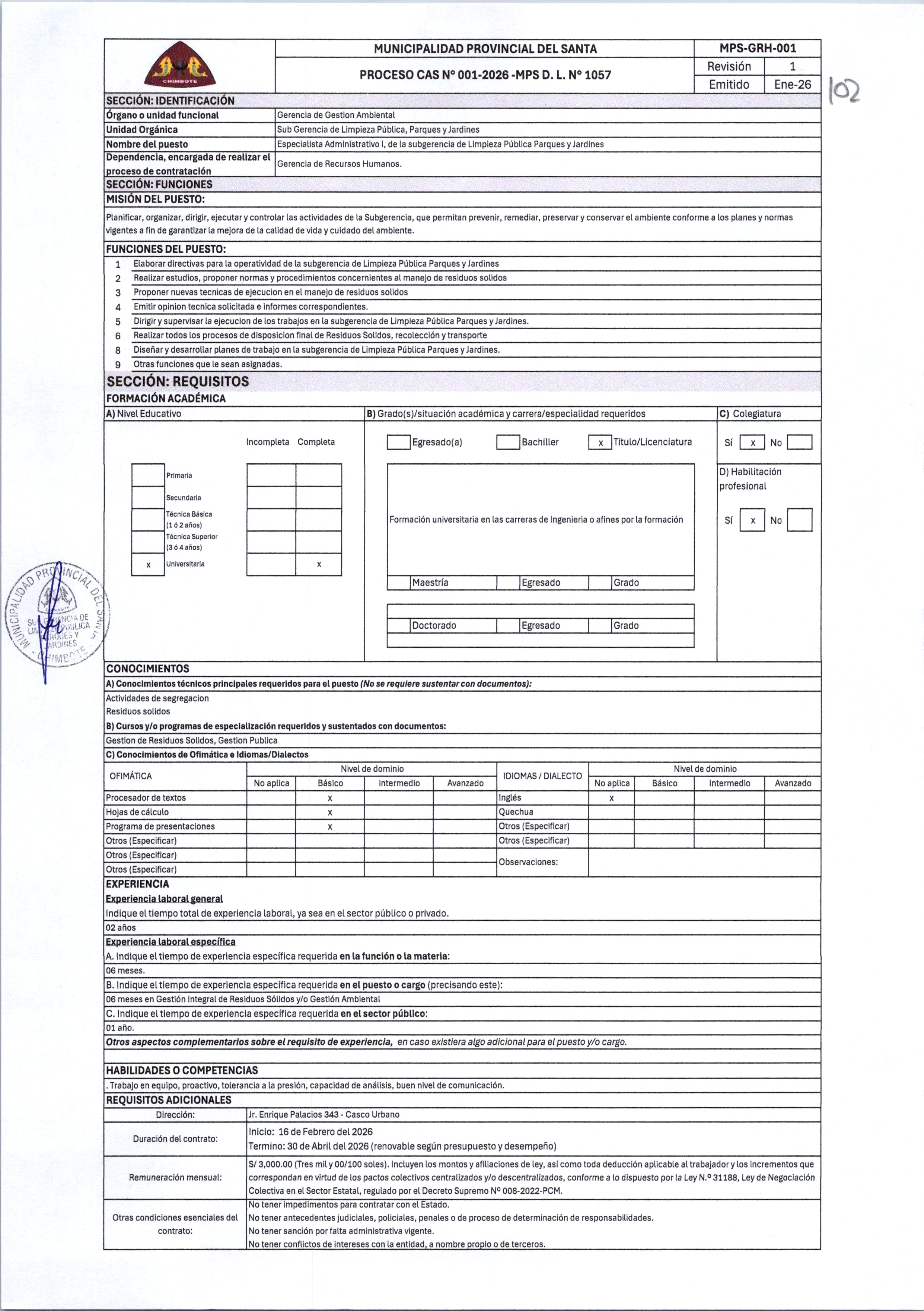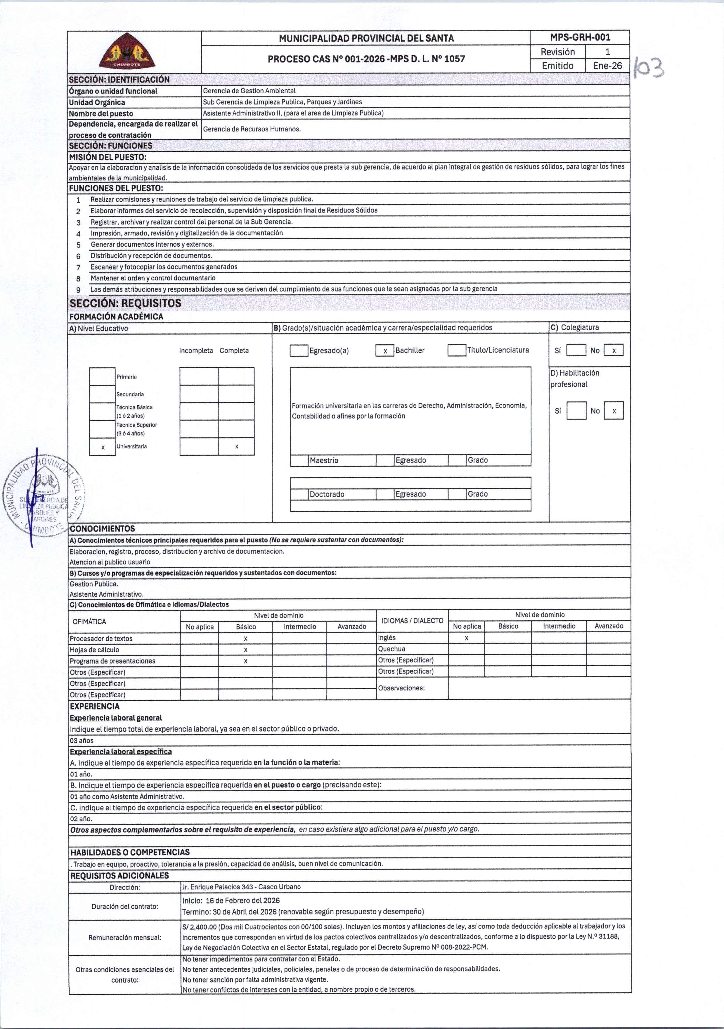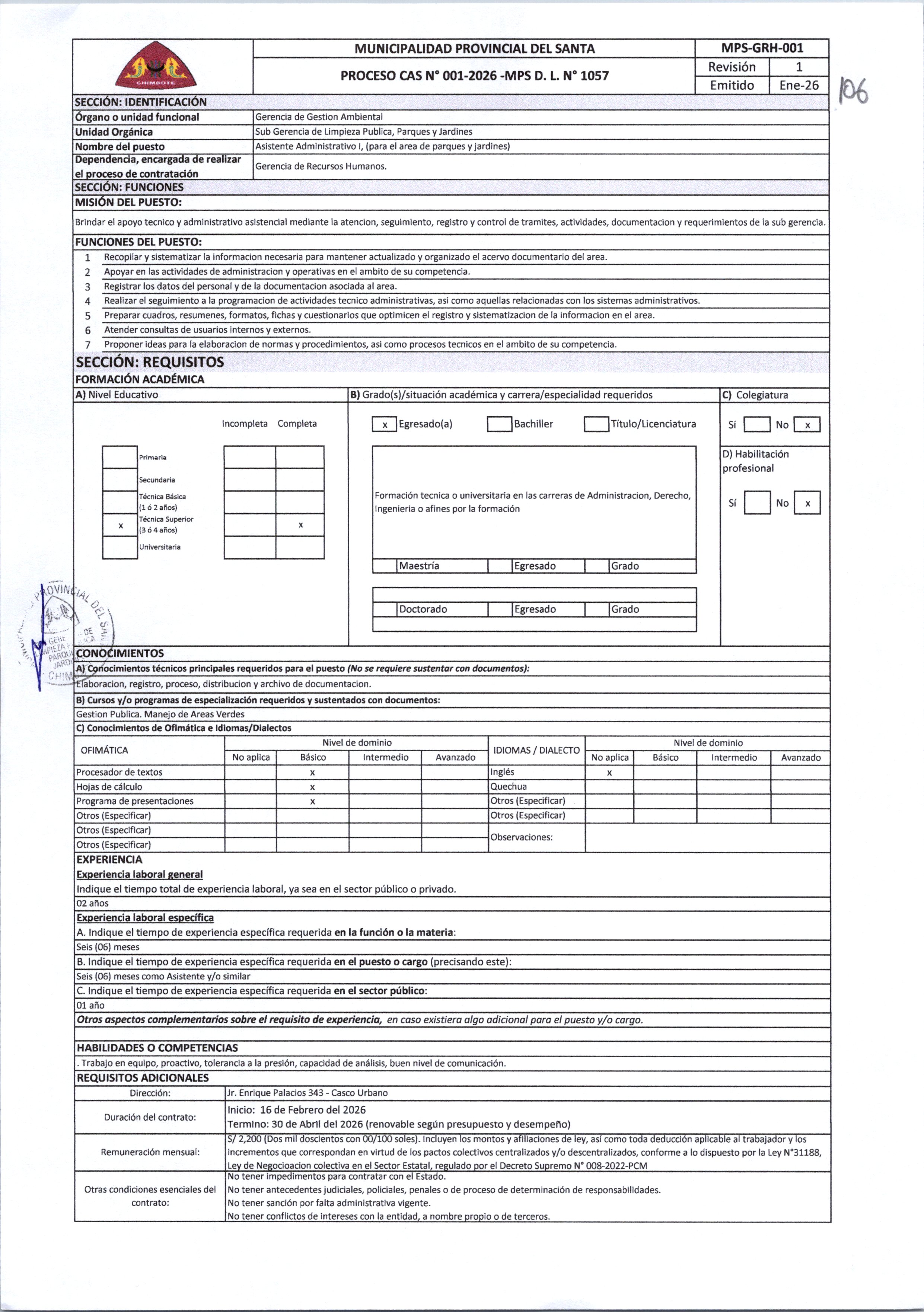 | 105 | PROCESO CAS N° 001-2026-MPS ASISTENTE ADMINISTRATIVO I (PARQUES Y JARDINES) |