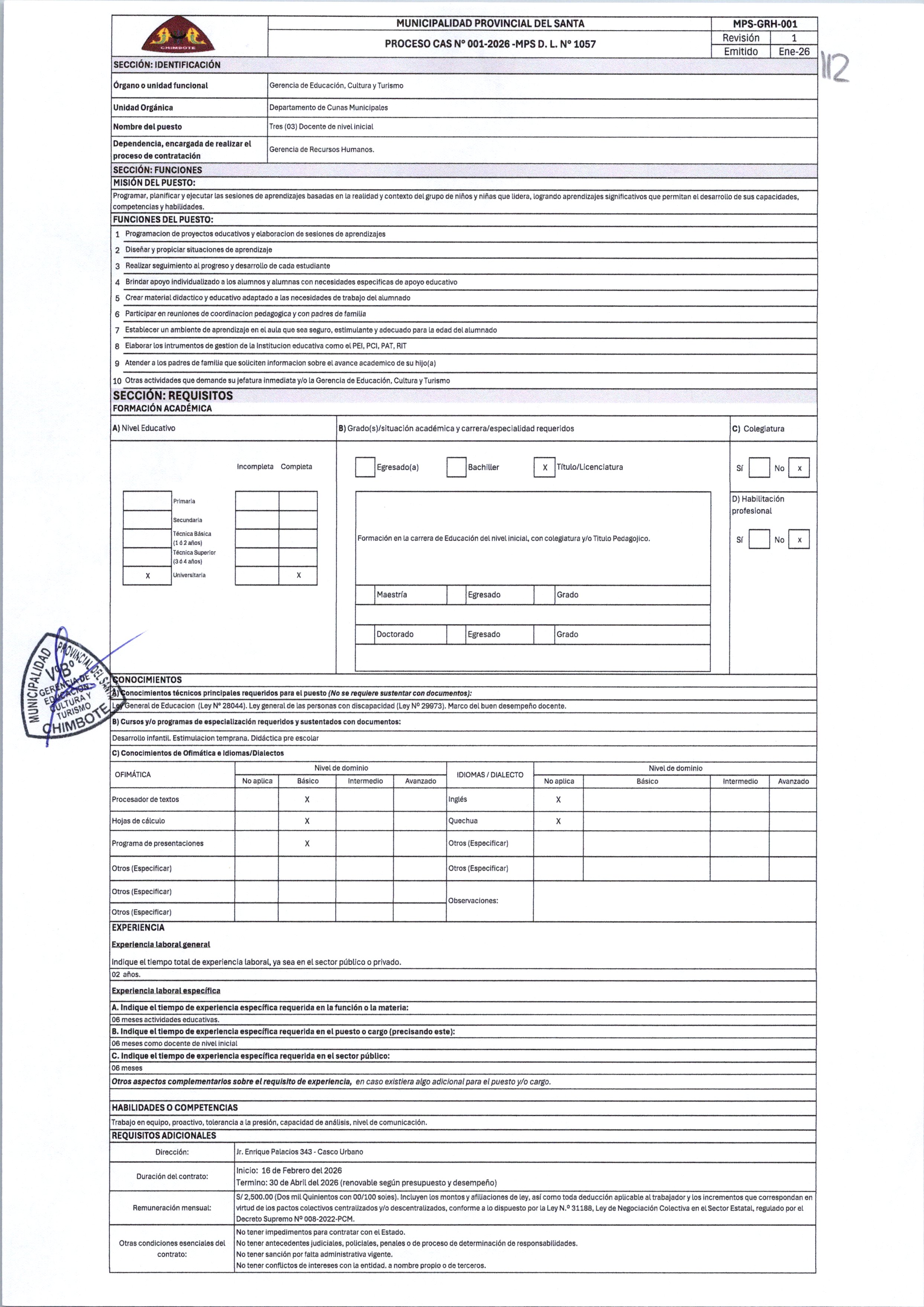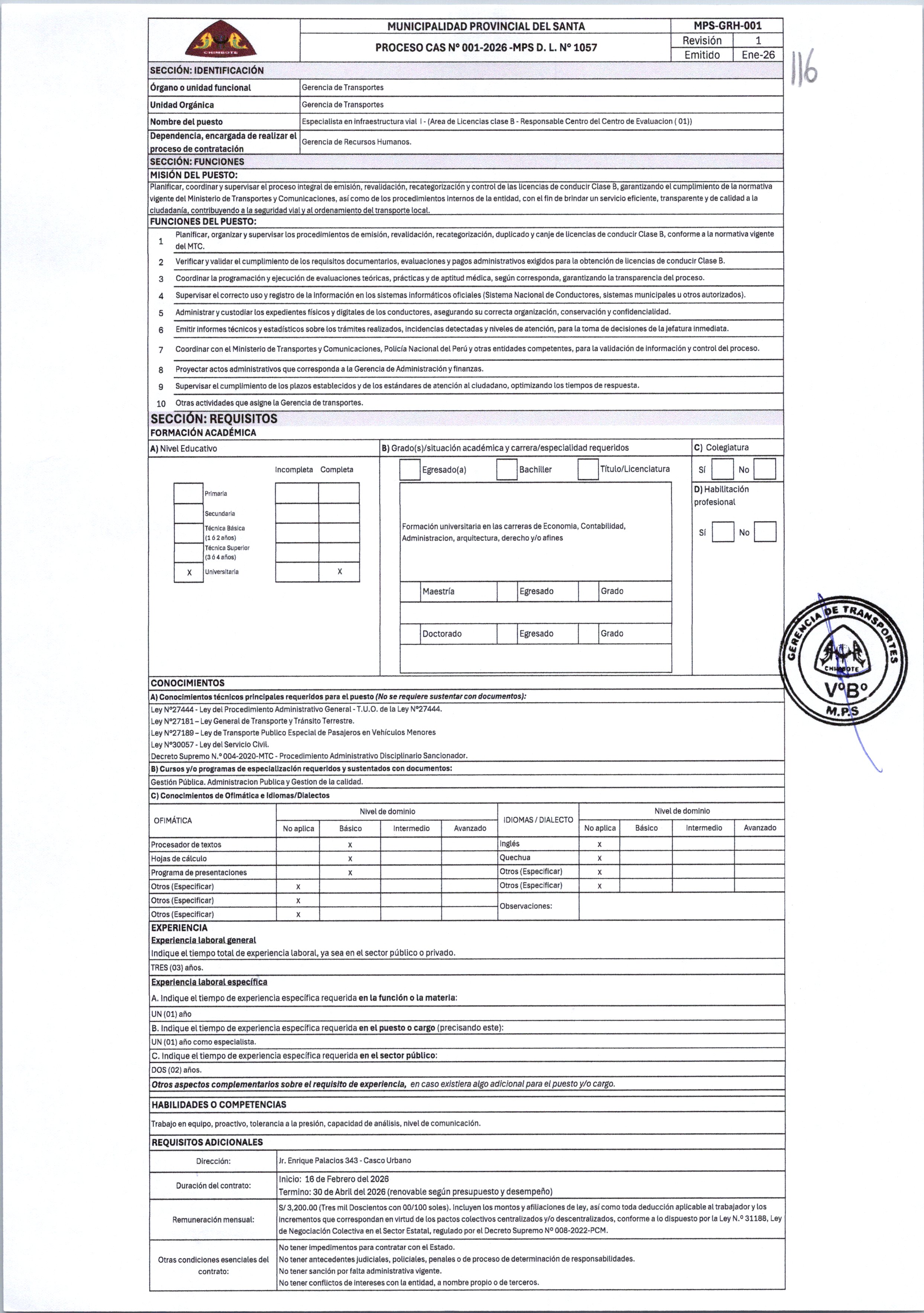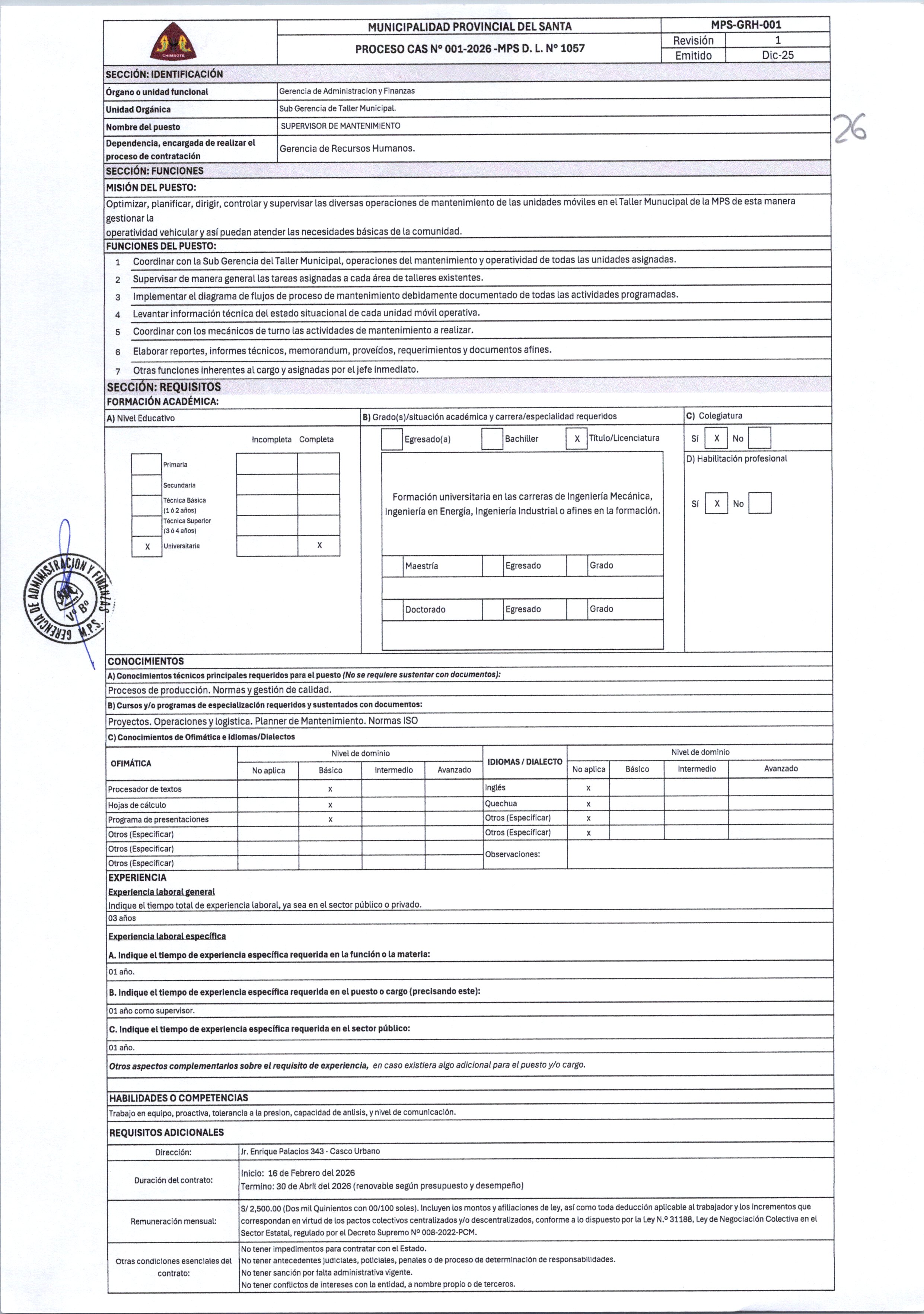 | 26 | PROCESO CAS N° 001-2026-MPS SUPERVISOR DE MANTENIMIENTO |
