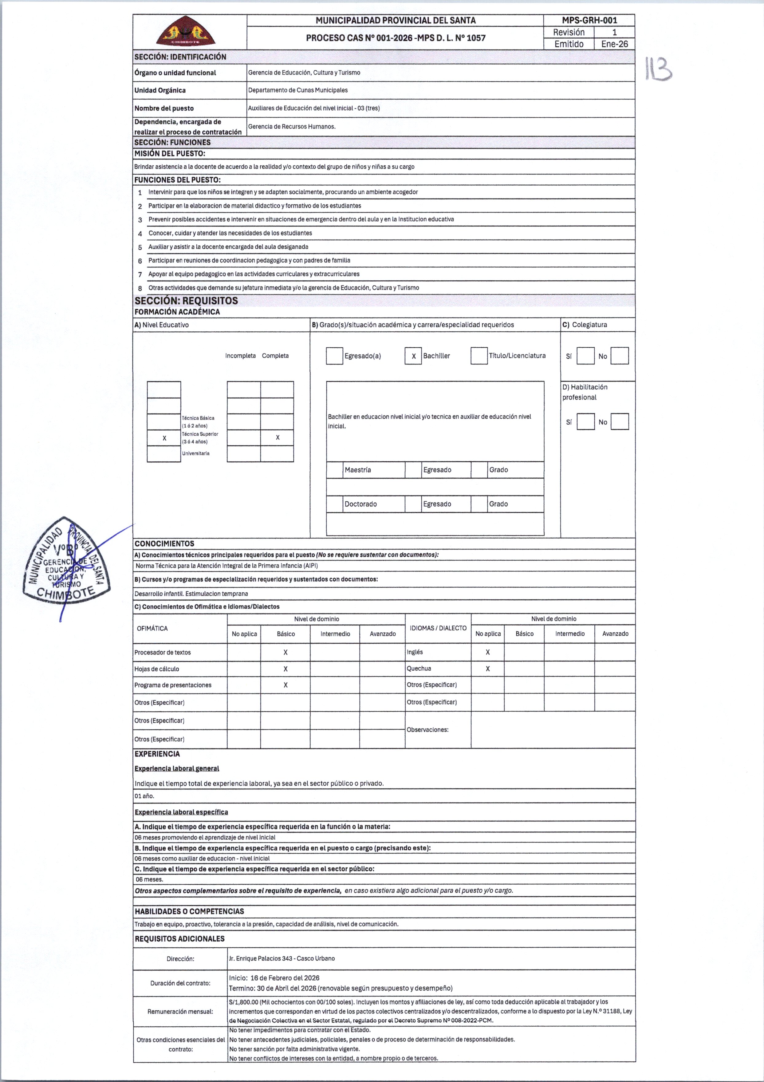 | 13 | PROCESO CAS N° 001-2026-MPS ESPECIALISTA EN CONTRATACIONES PUBLICAS II |