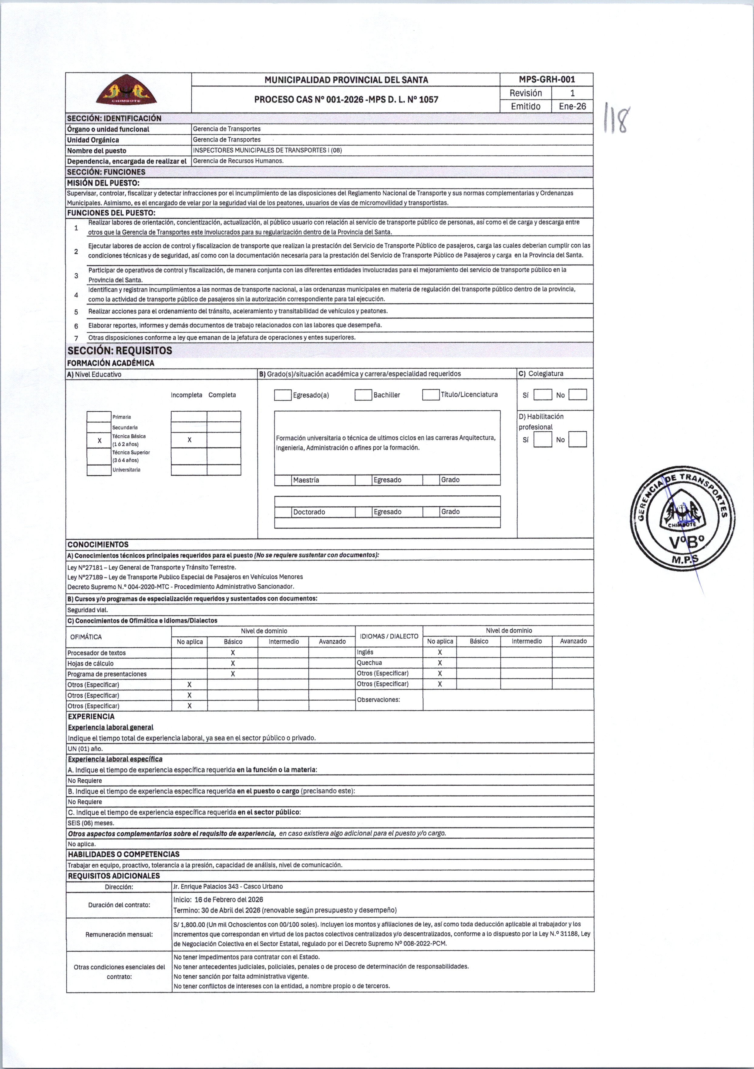 | 118 | PROCESO CAS N° 001-2026-MPS INSPECTOR DE TRANSPORTE I |