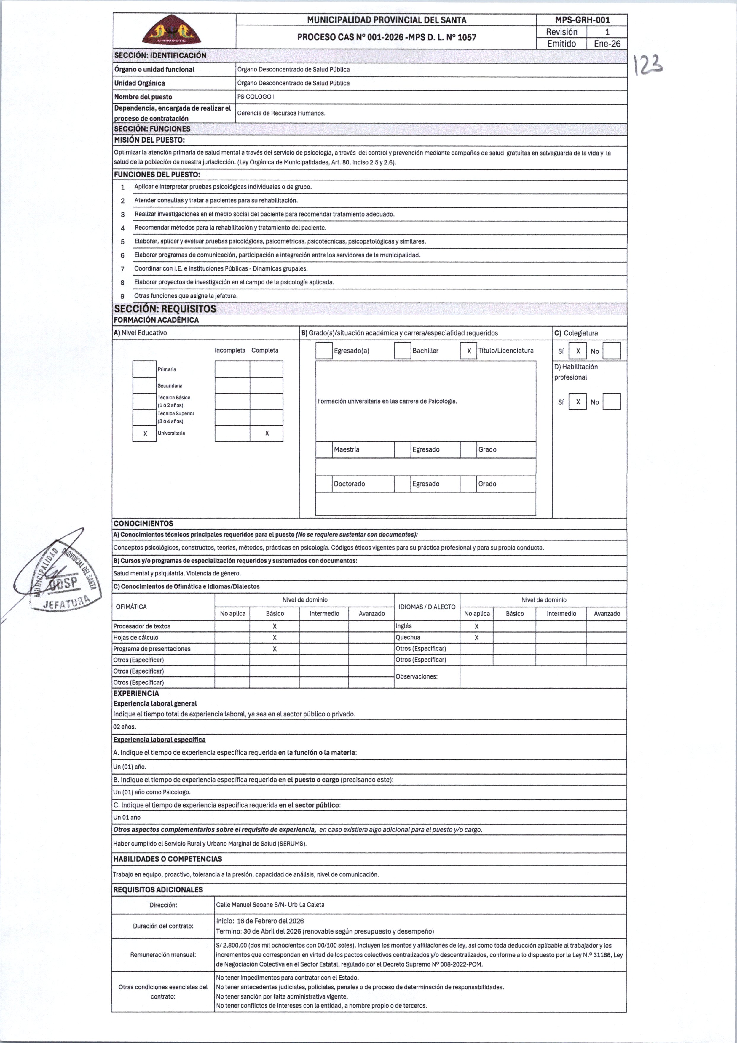 | 123 | PROCESO CAS N° 001-2026-MPS PSICÓLOGO (A) I |