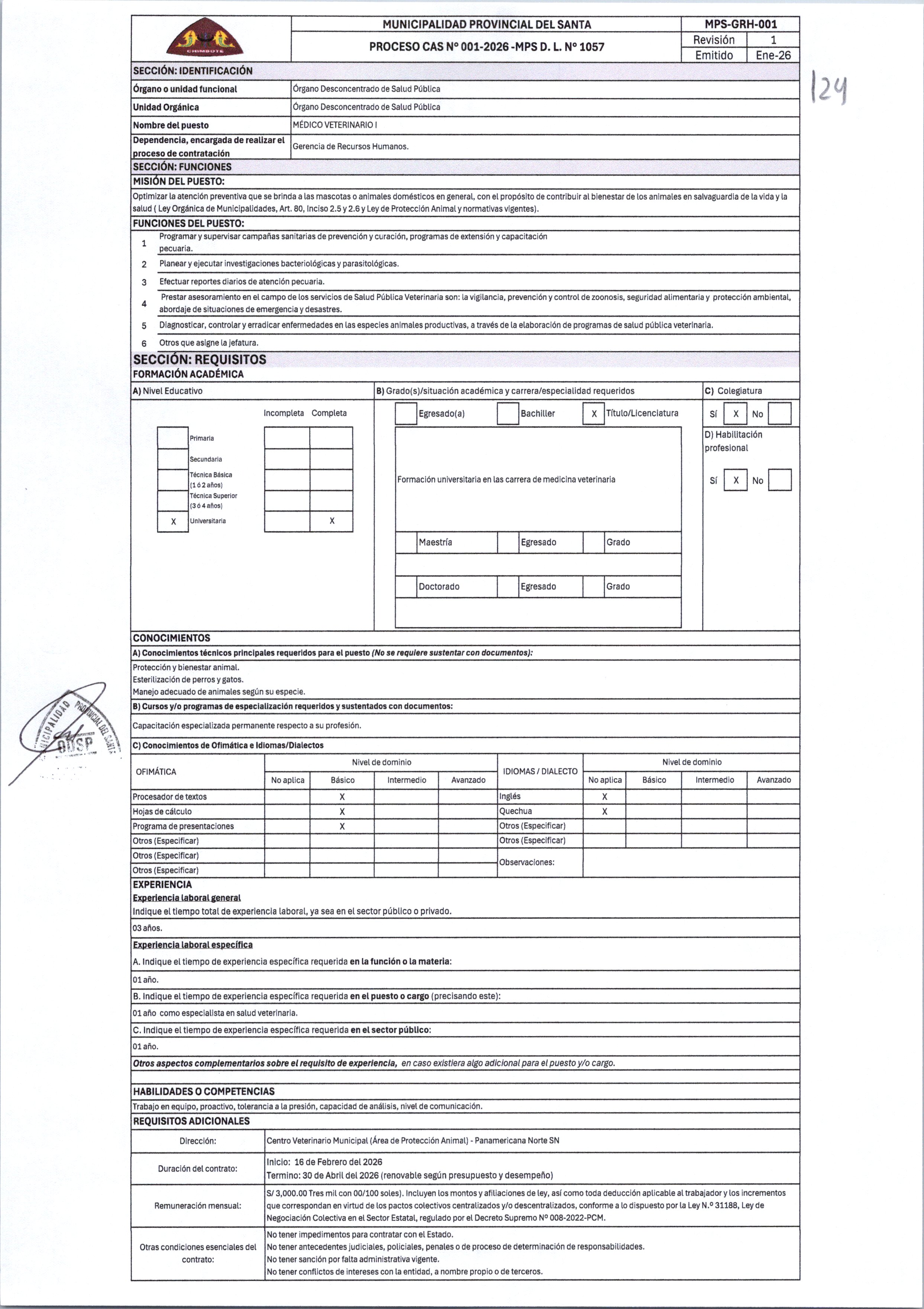 | 124 | PROCESO CAS N° 001-2026-MPS MÉDICO VETERINARIO I |