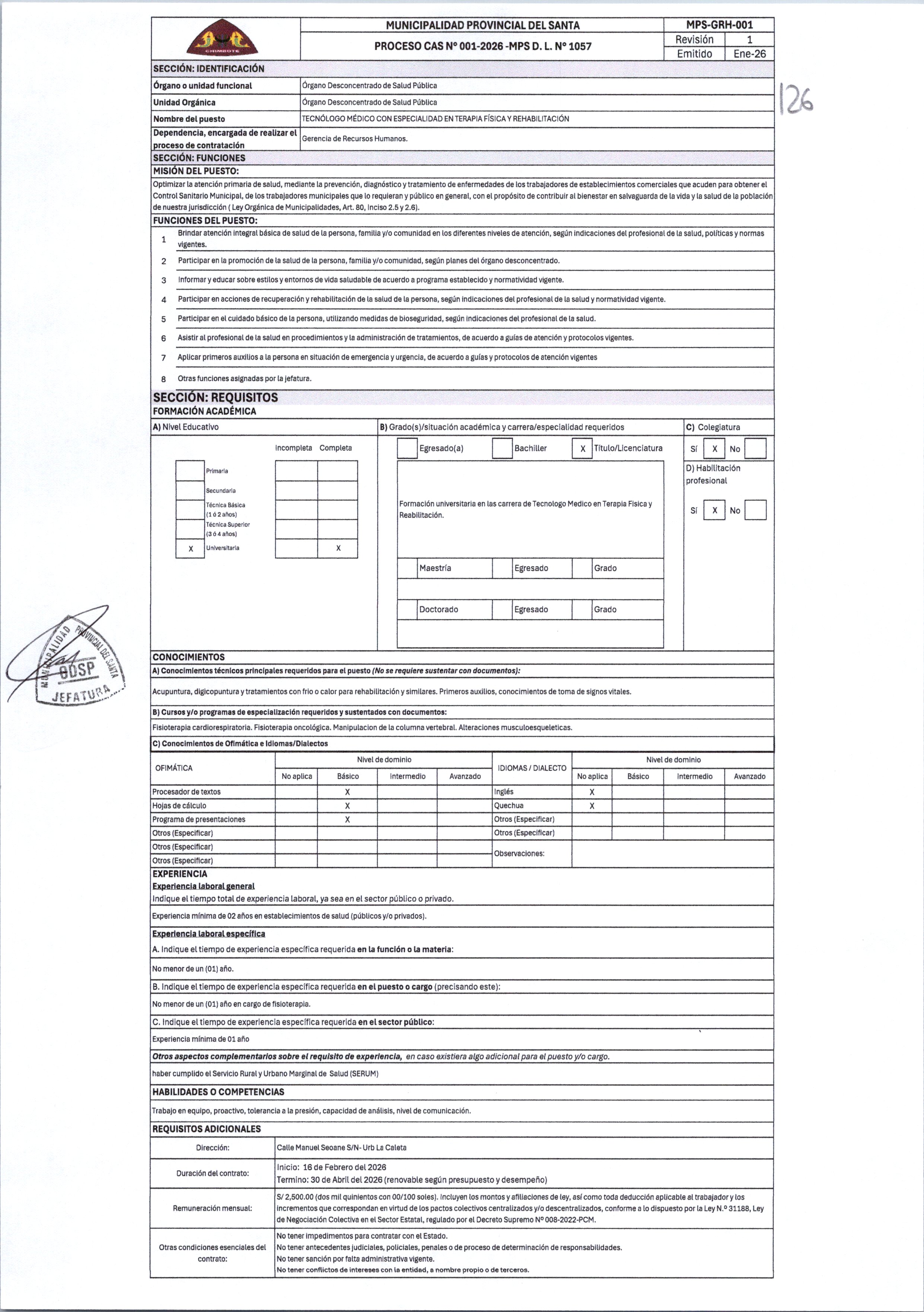 | 126 | PROCESO CAS N° 001-2026-MPS TECNÓLOGO MÉDICO EN TERAPIA FÍSICA Y REHABILITACION |