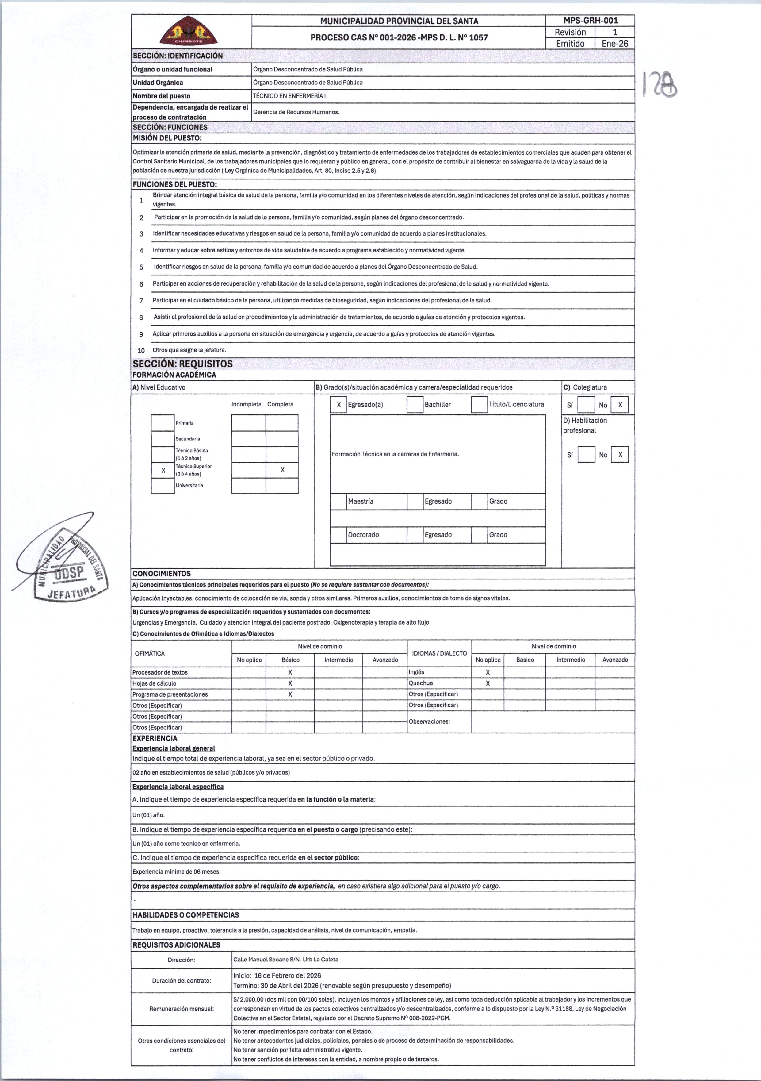 | 128 | PROCESO CAS N° 001-2026-MPS TÉCNICO EN ENFERMERIA |