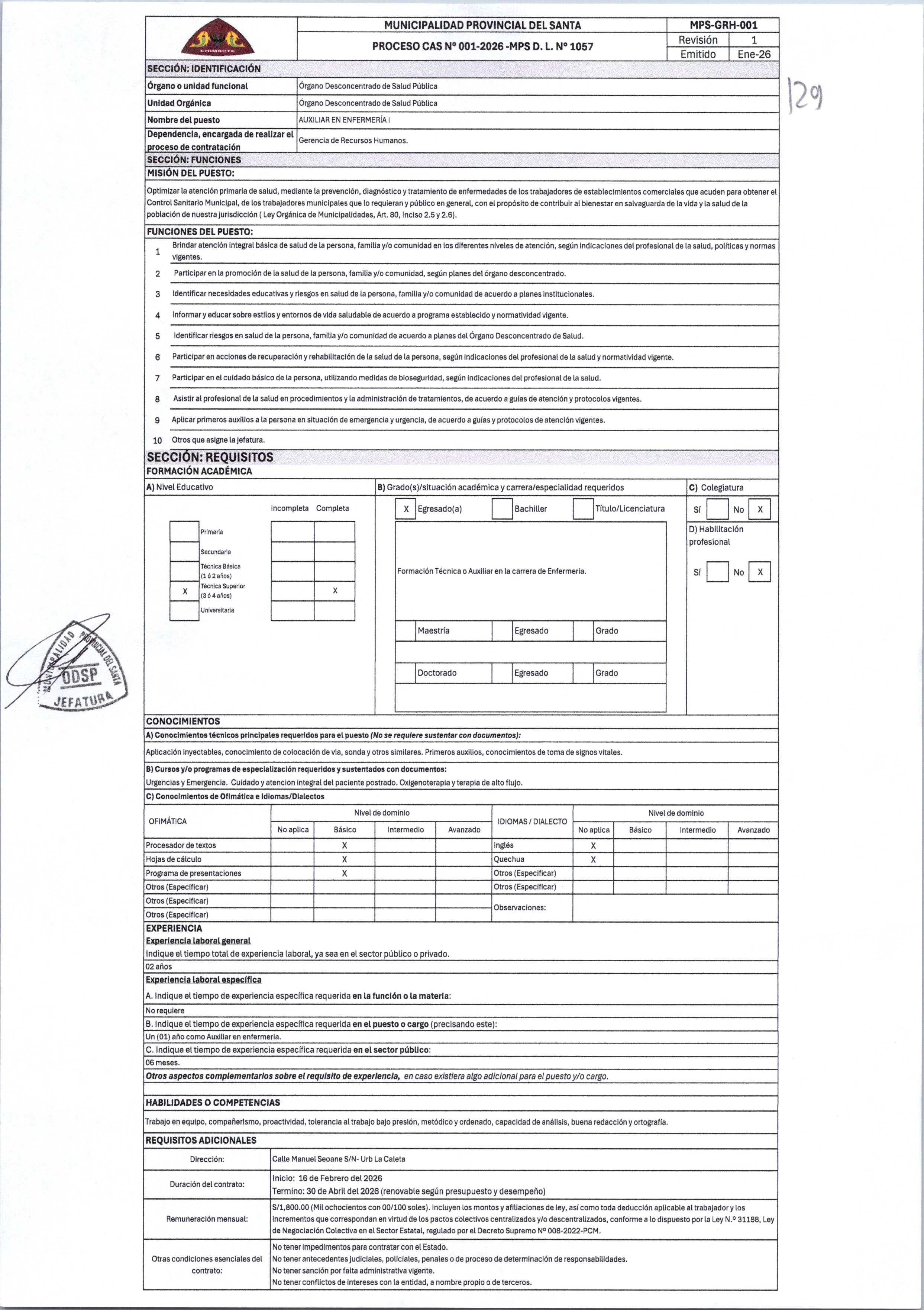 | 129 | PROCESO CAS N° 001-2026-MPS AUXILIAR DE ENFERMERIA I |