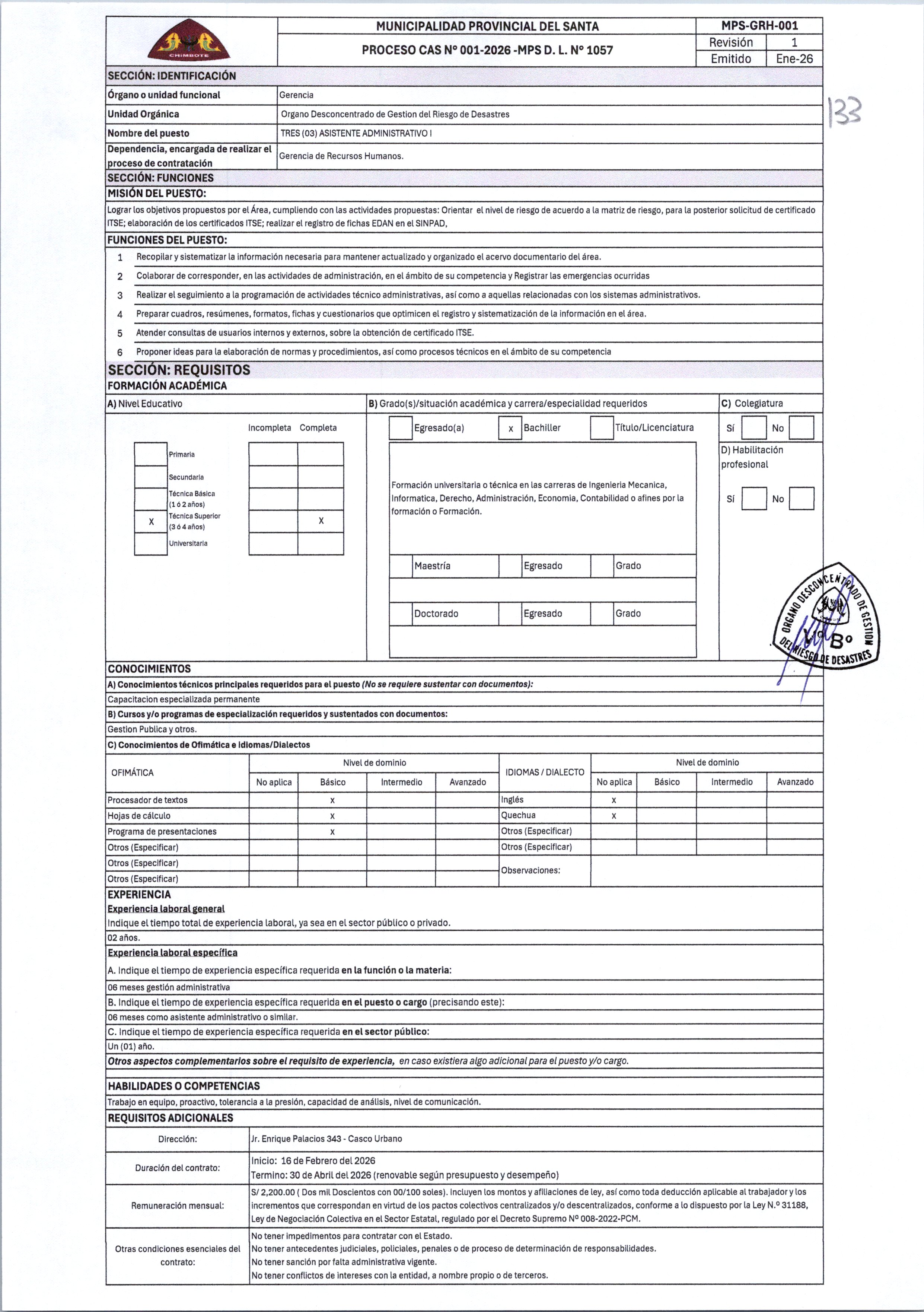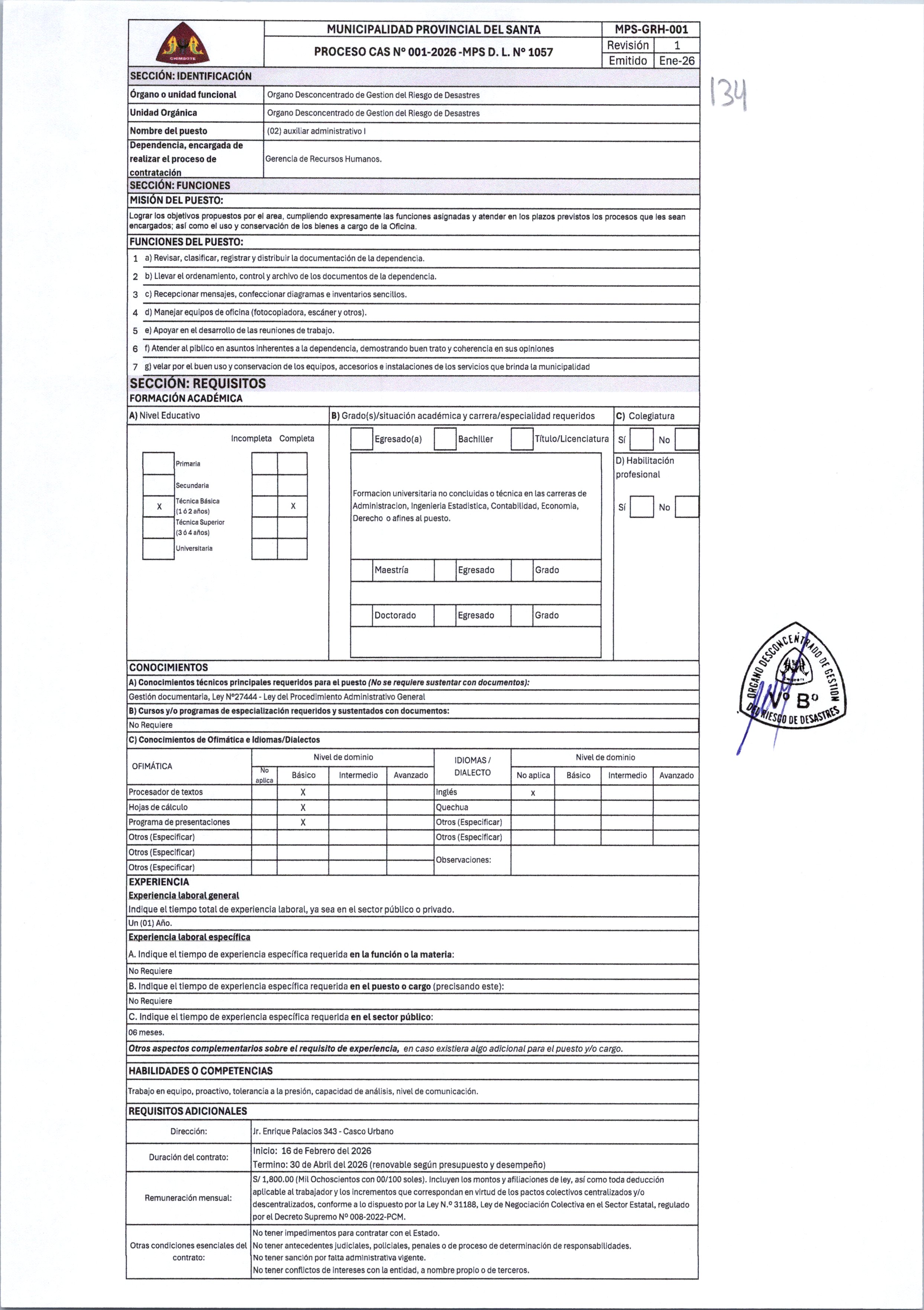 | 134 | PROCESO CAS N° 001-2026-MPS AUXILIAR ADMINISTRATIVO I |