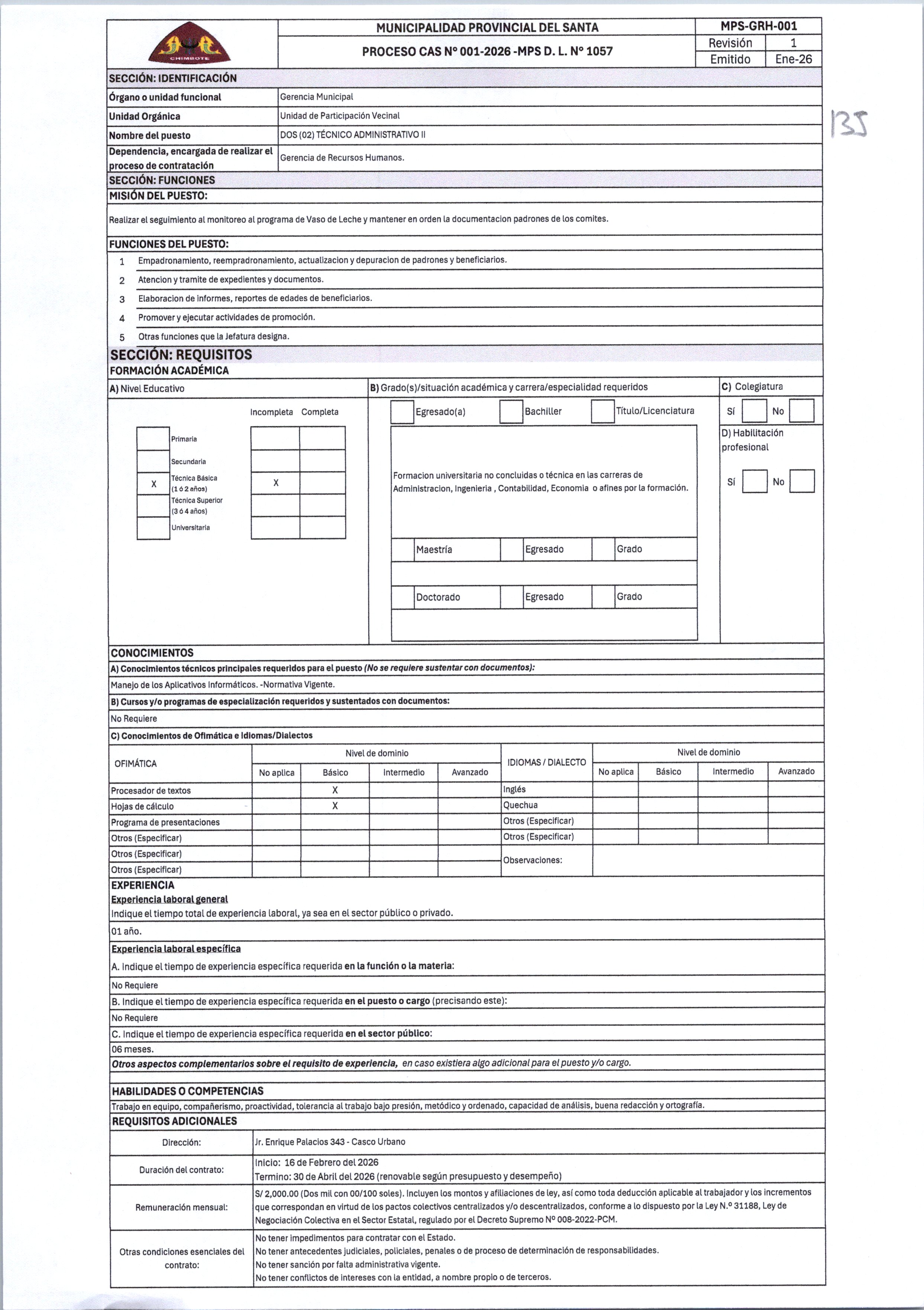 | 135 | PROCESO CAS N° 001-2026-MPS TECNICO ADMINISTRATIVO II |