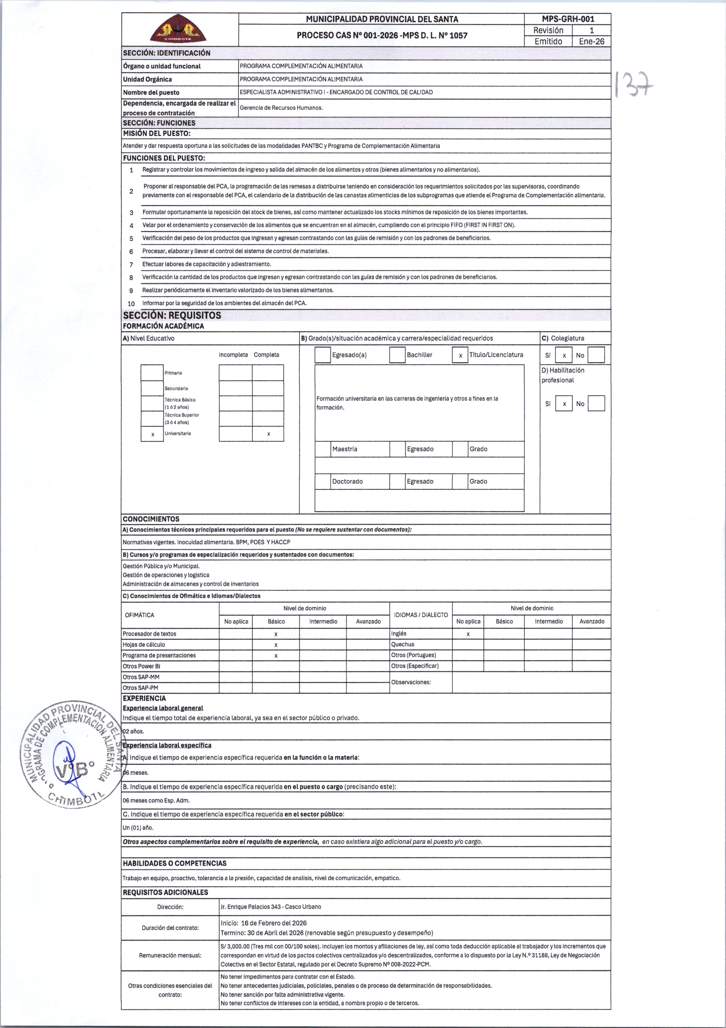 | 137 | PROCESO CAS N° 001-2026-MPS ESPECIALISTA ADMINISTRATIVO I (CONTROL DE CALIDAD) |