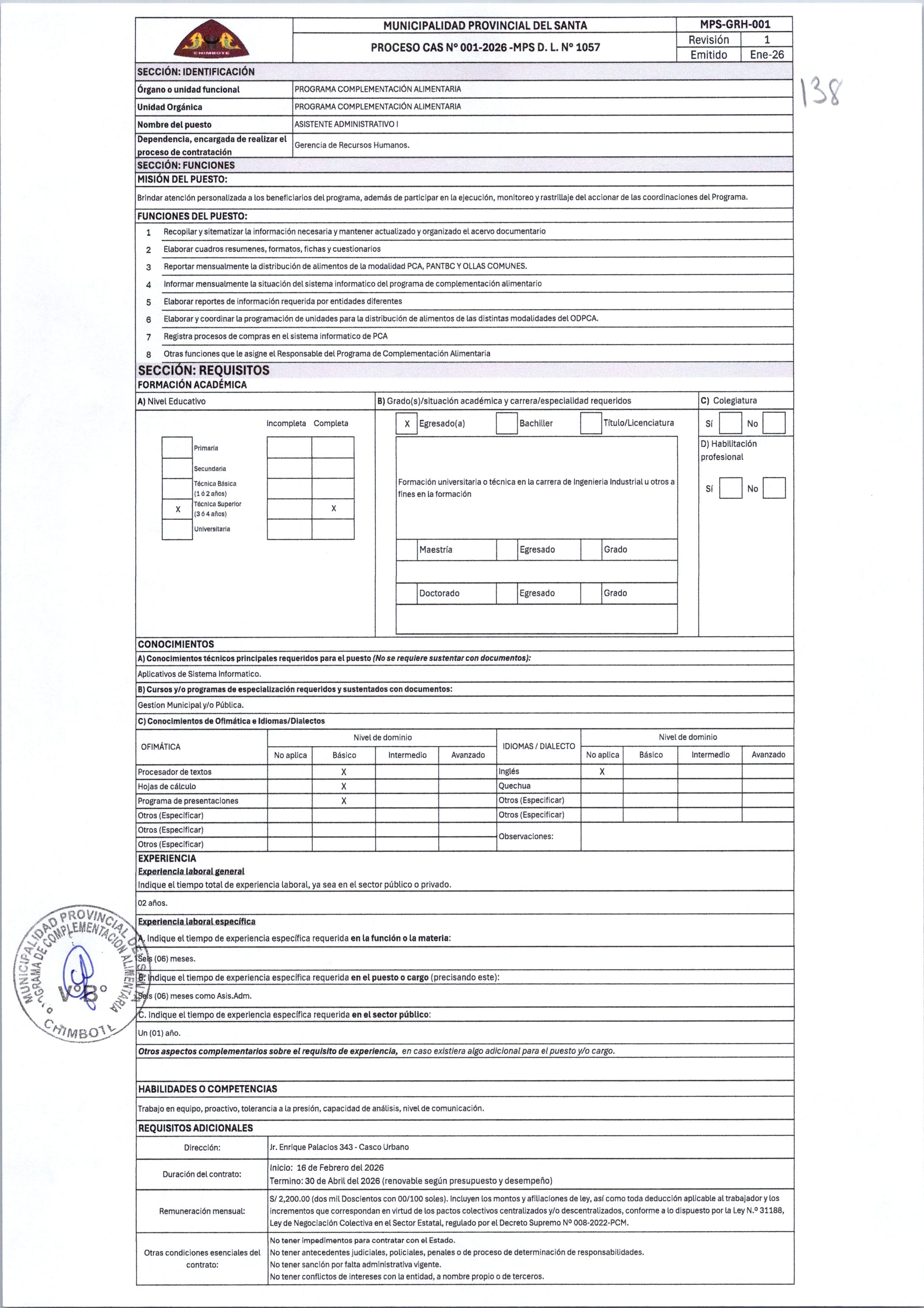 | 138 | PROCESO CAS N° 001-2026-MPS ASISTENTE ADMINISTRATIVO I |