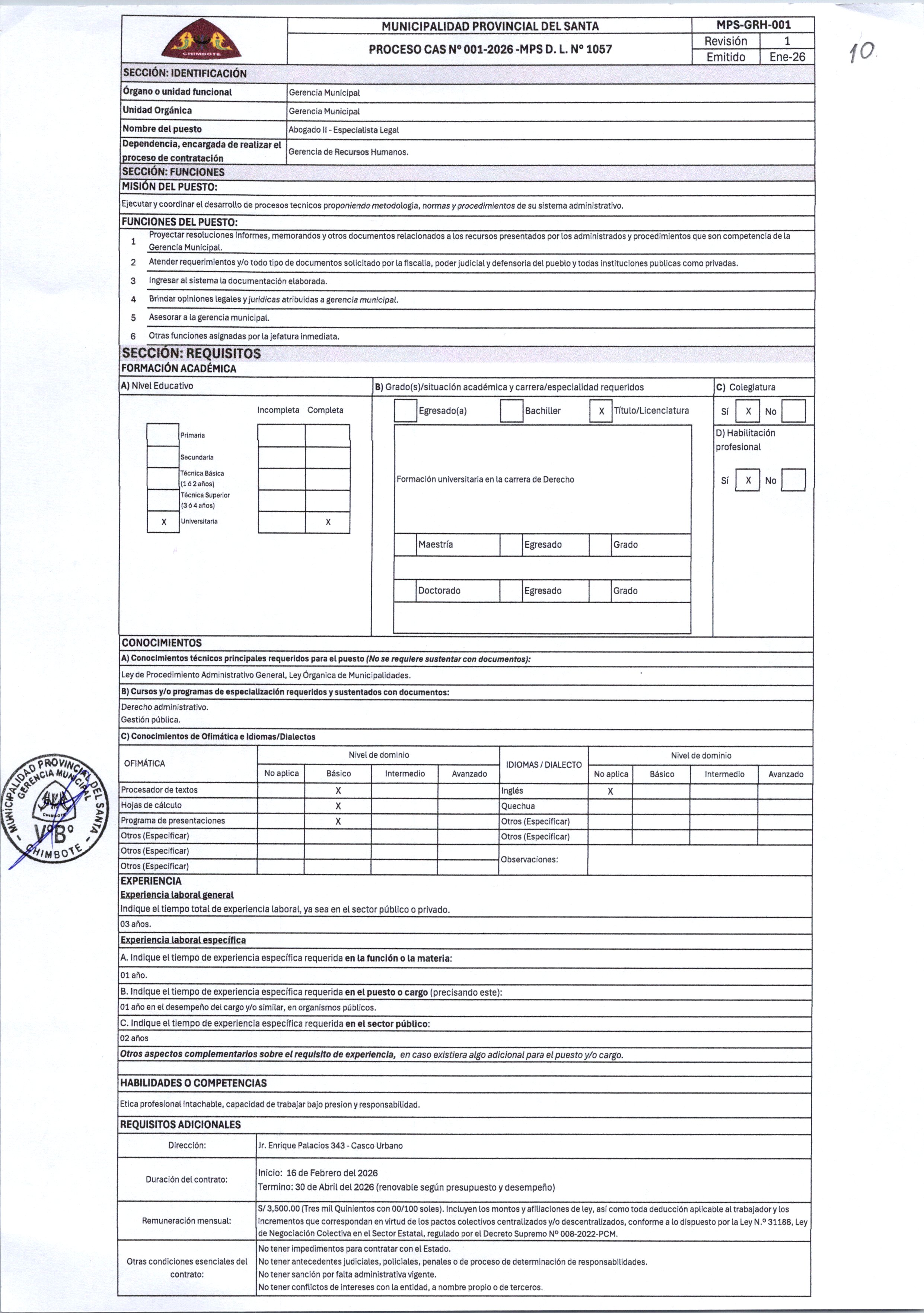 | 10 | PROCESO CAS N° 001-2026-MPS ABOGADO II |