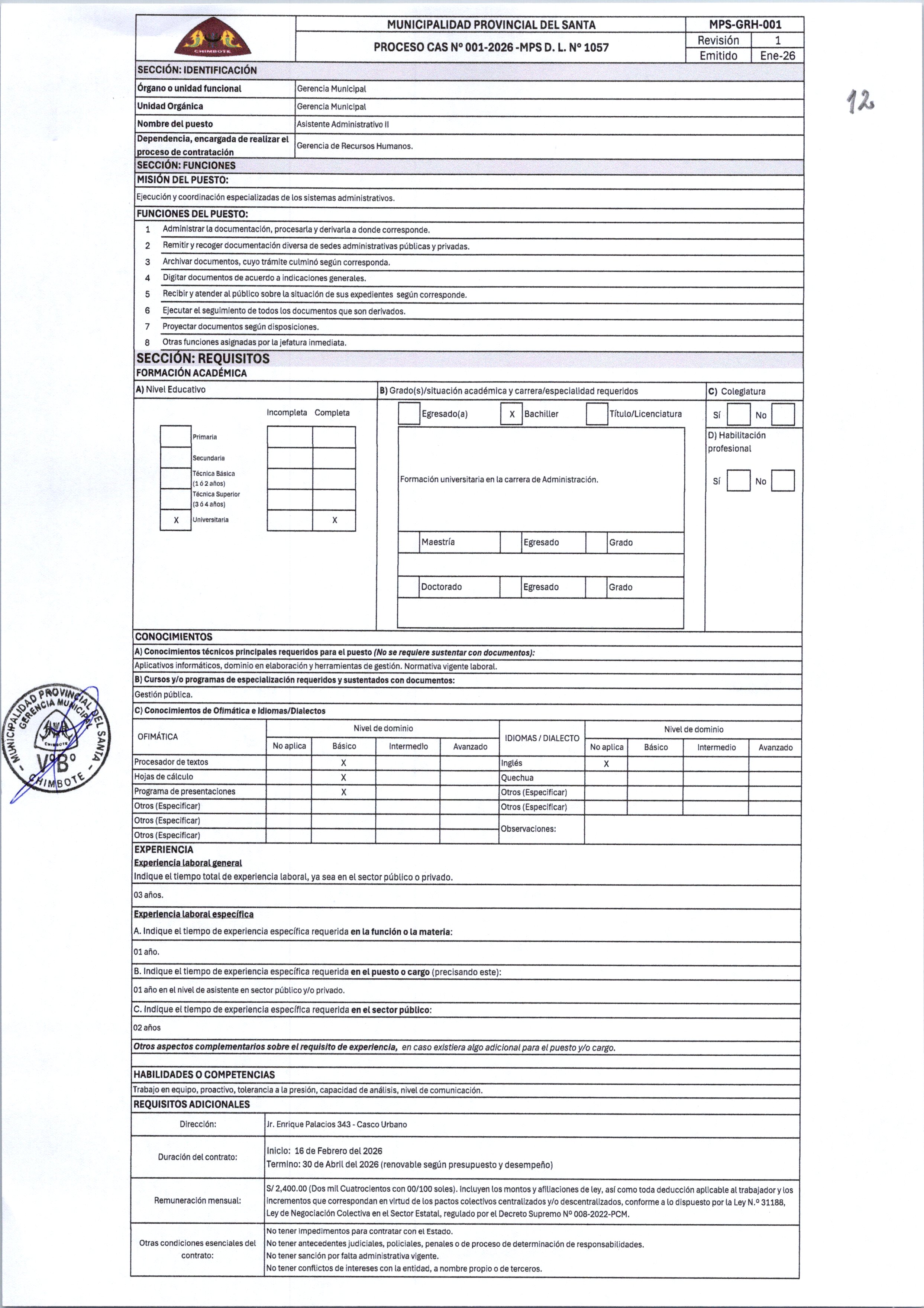 | 12 | PROCESO CAS N° 001-2026-MPS ASISTENTE ADMINISTRATIVO II |