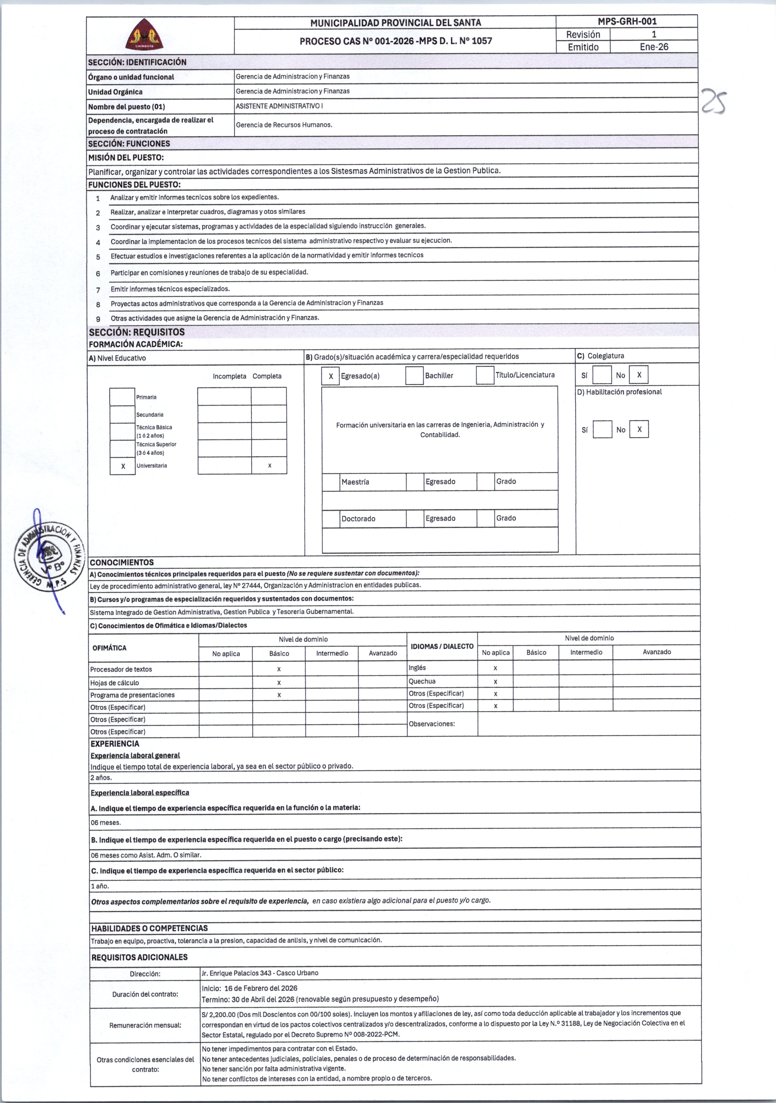 | 25 | PROCESO CAS N° 001-2026-MPS ASISTENTE ADMINISTRATIVO I |