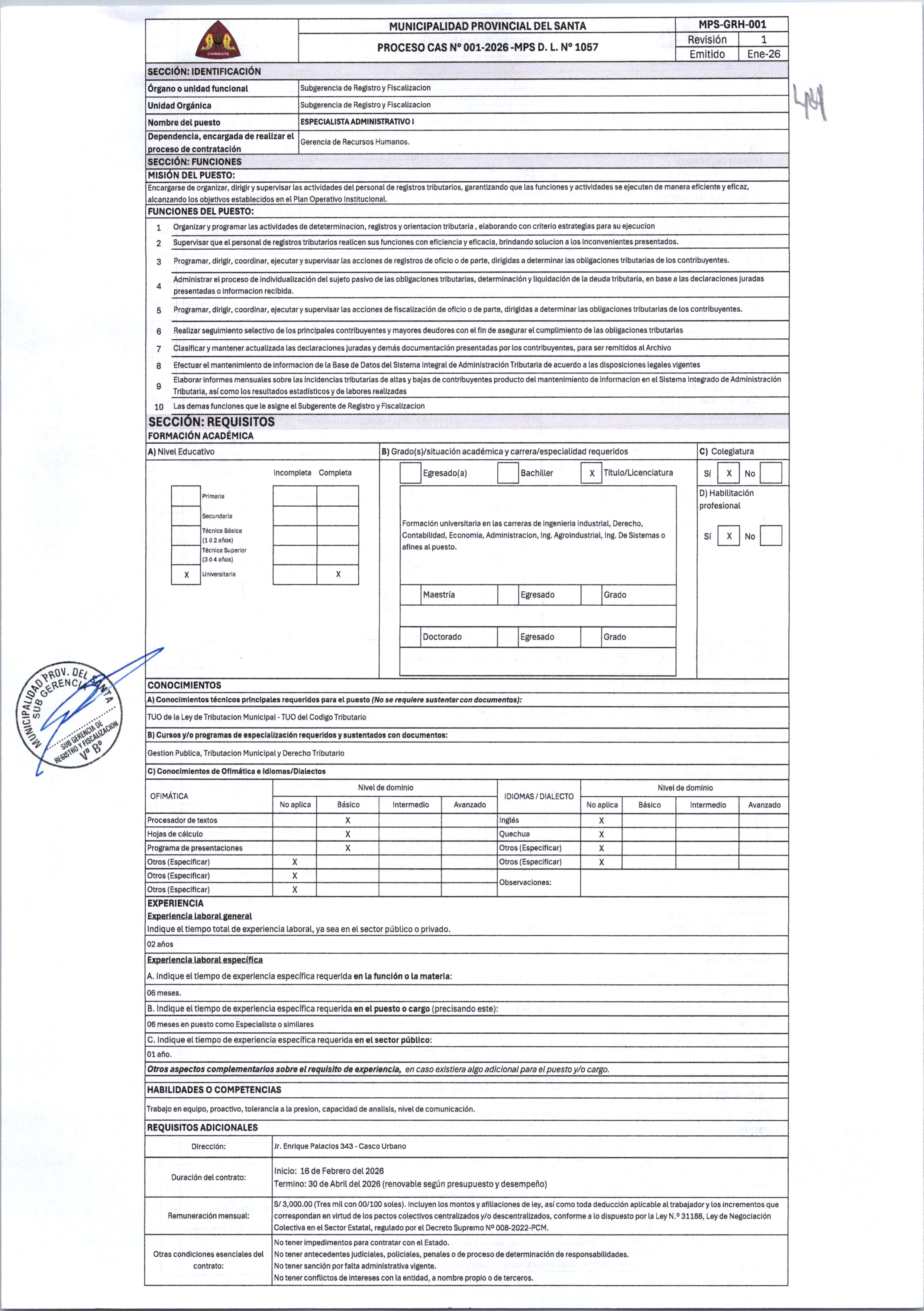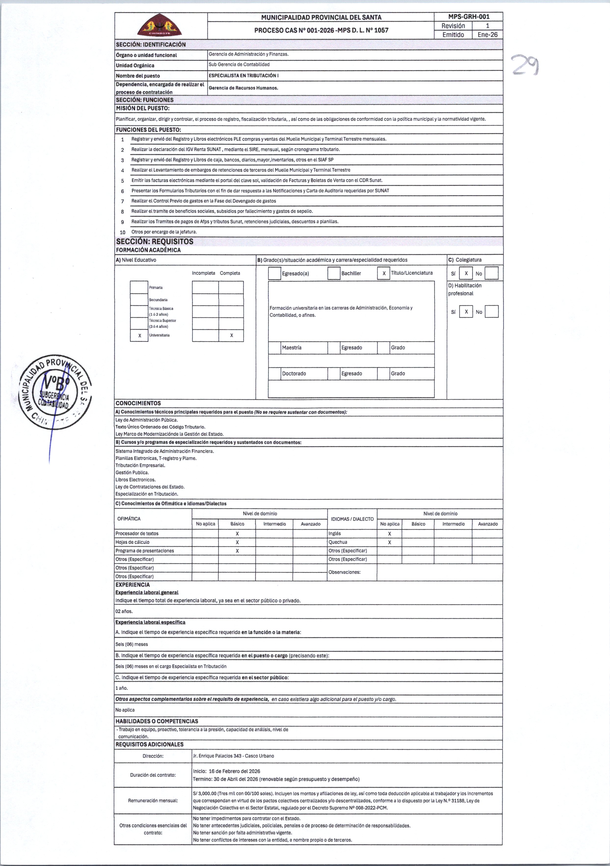 | 29 | PROCESO CAS N° 001-2026-MPS ESPECIALISTA EN TRIBUTACIÓN I |