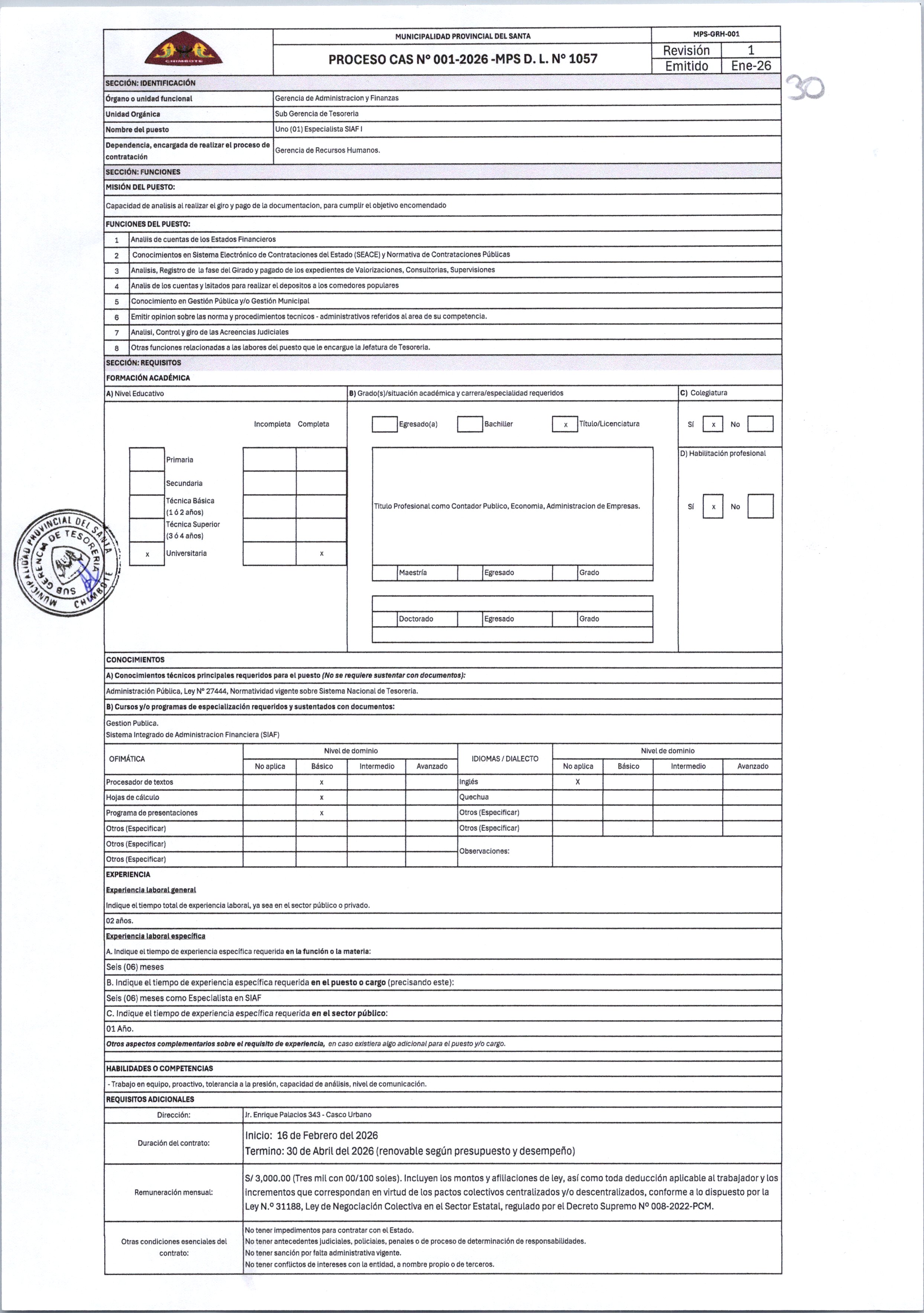 | 30 | PROCESO CAS N° 001-2026-MPS ESPECIALISTA EN SIAF I |