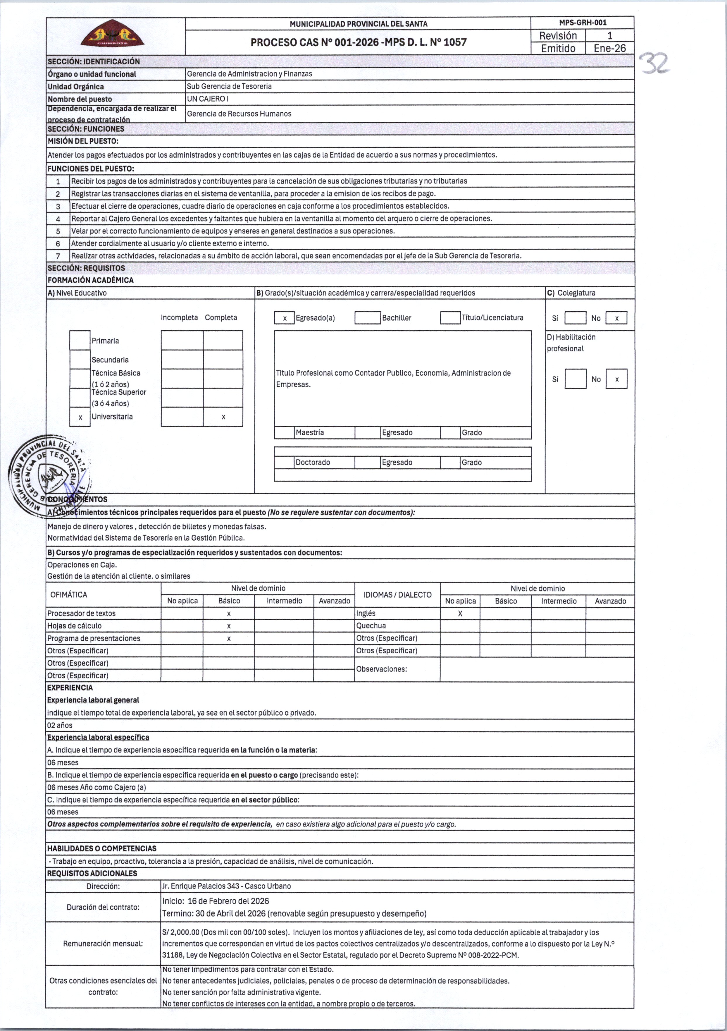 | 32 | PROCESO CAS N° 001-2026-MPS CAJERO I |