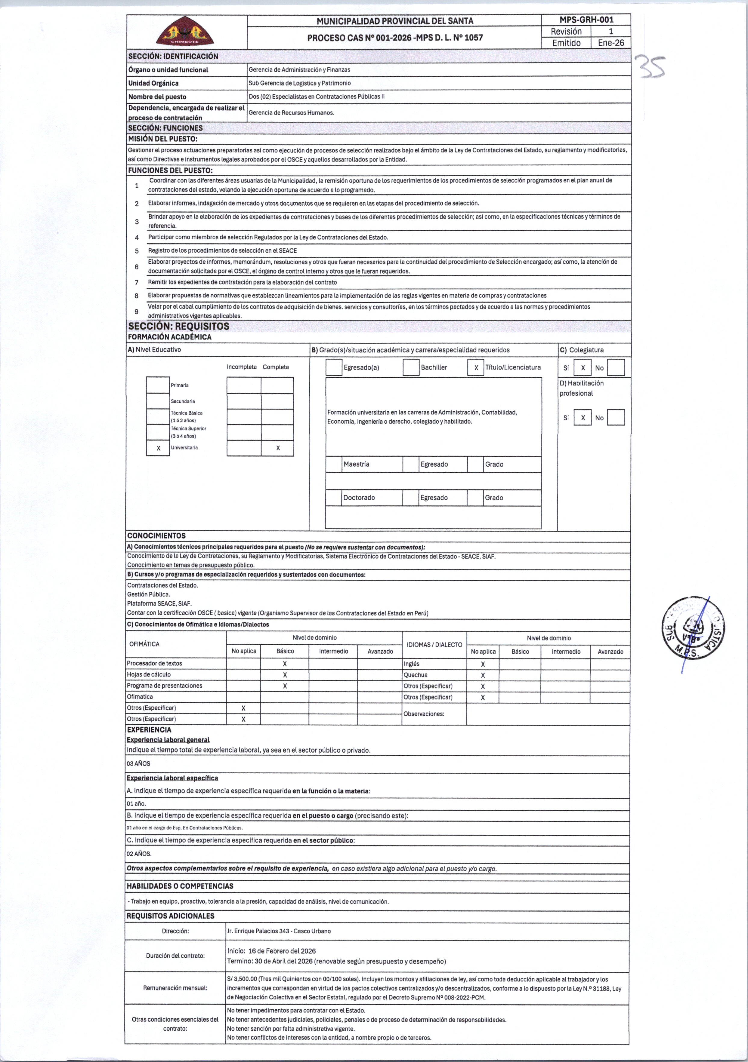 | 35 | PROCESO CAS N° 001-2026-MPS ESPECIALISTA EN CONTRATACIONES PUBLICAS II |
