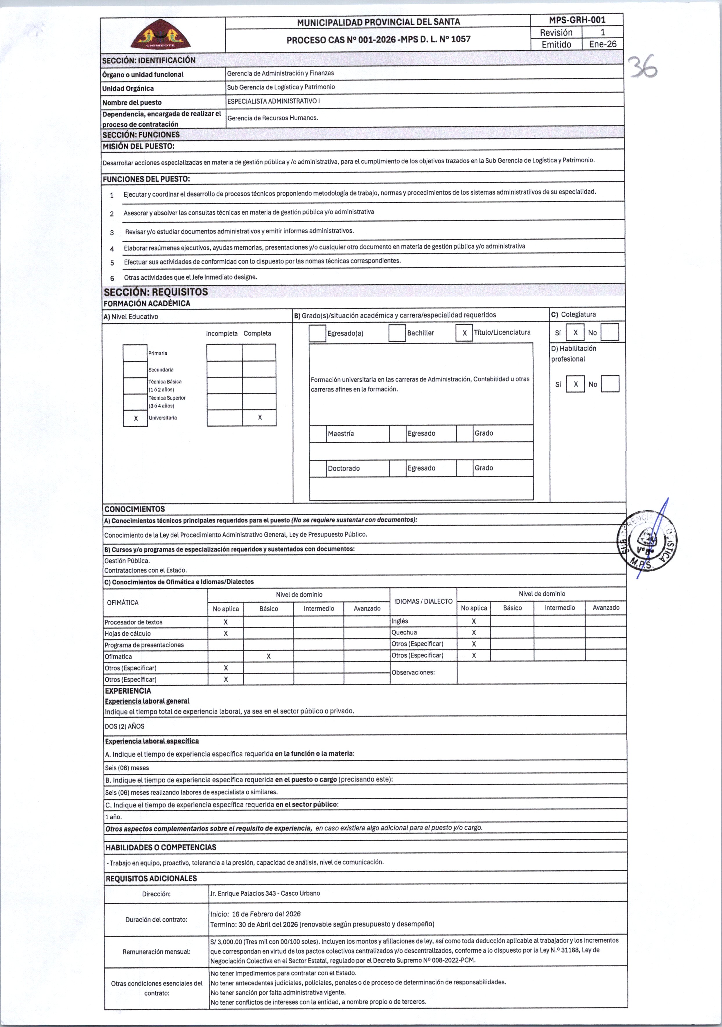 | 36 | PROCESO CAS N° 001-2026-MPS ESPECIALISTA ADMINISTRATIVO I |