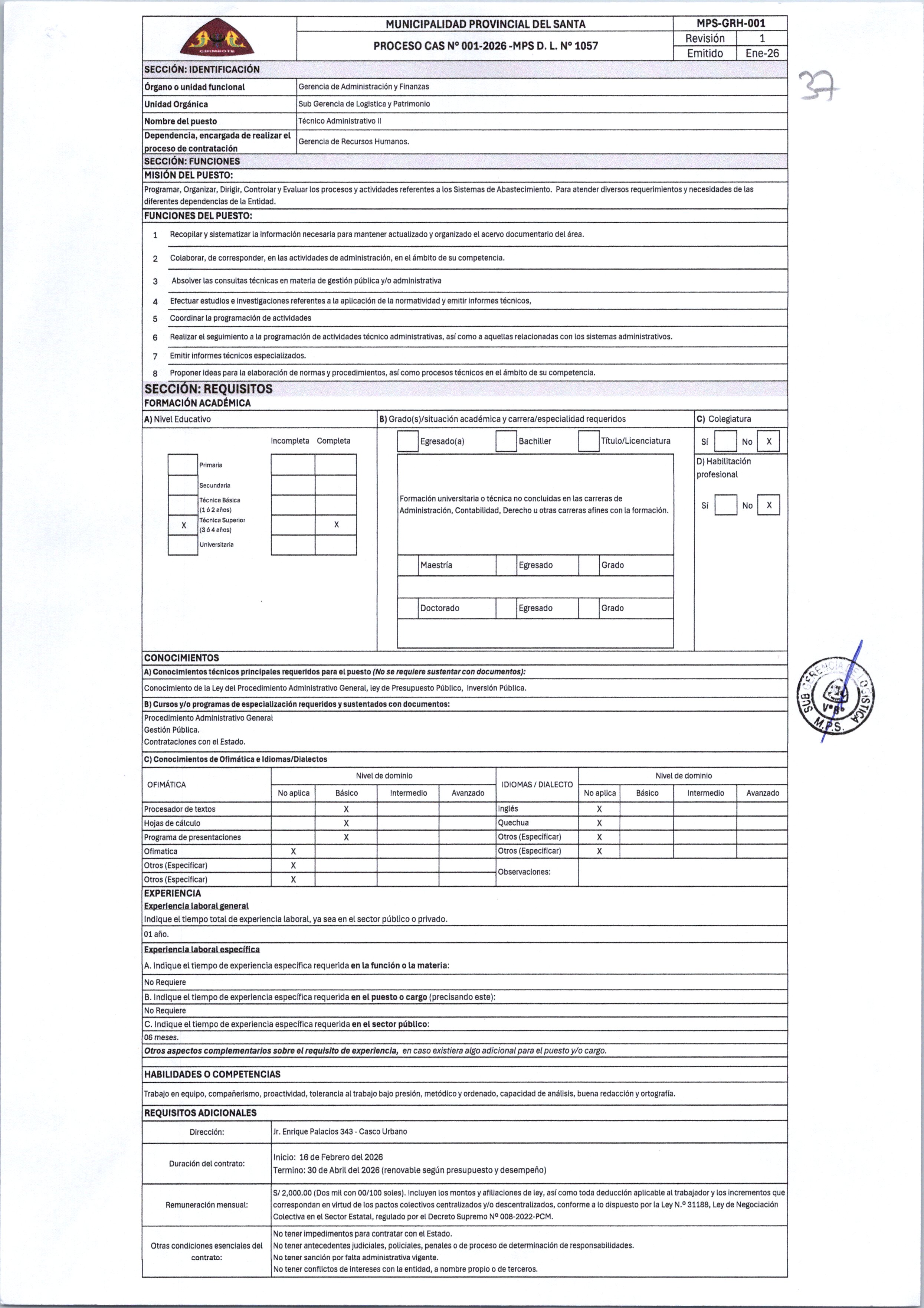 | 37 | PROCESO CAS N° 001-2026-MPS TECNICO ADMINISTRATIVO II |