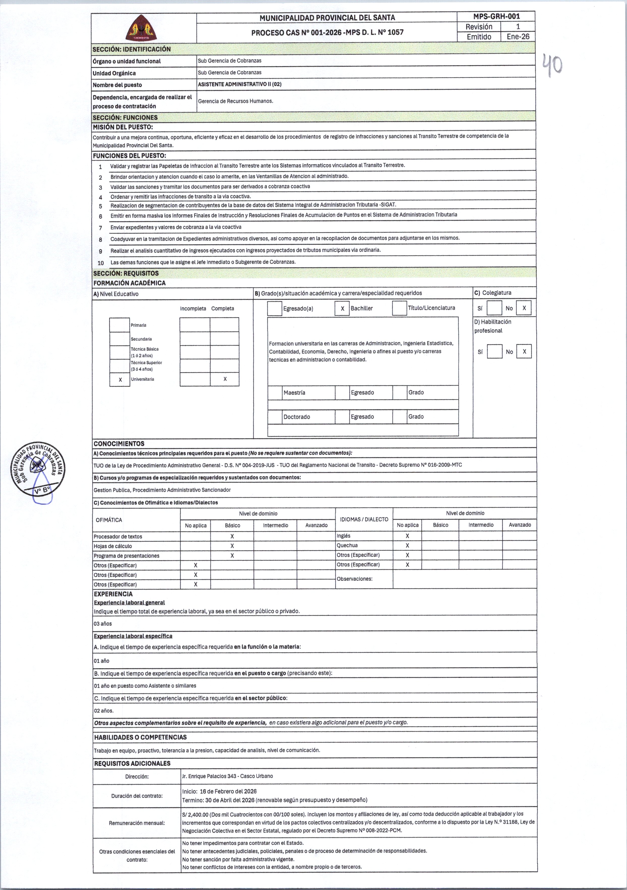 | 40 | PROCESO CAS N° 001-2026-MPS ASISTENTE ADMINISTRATIVO II |