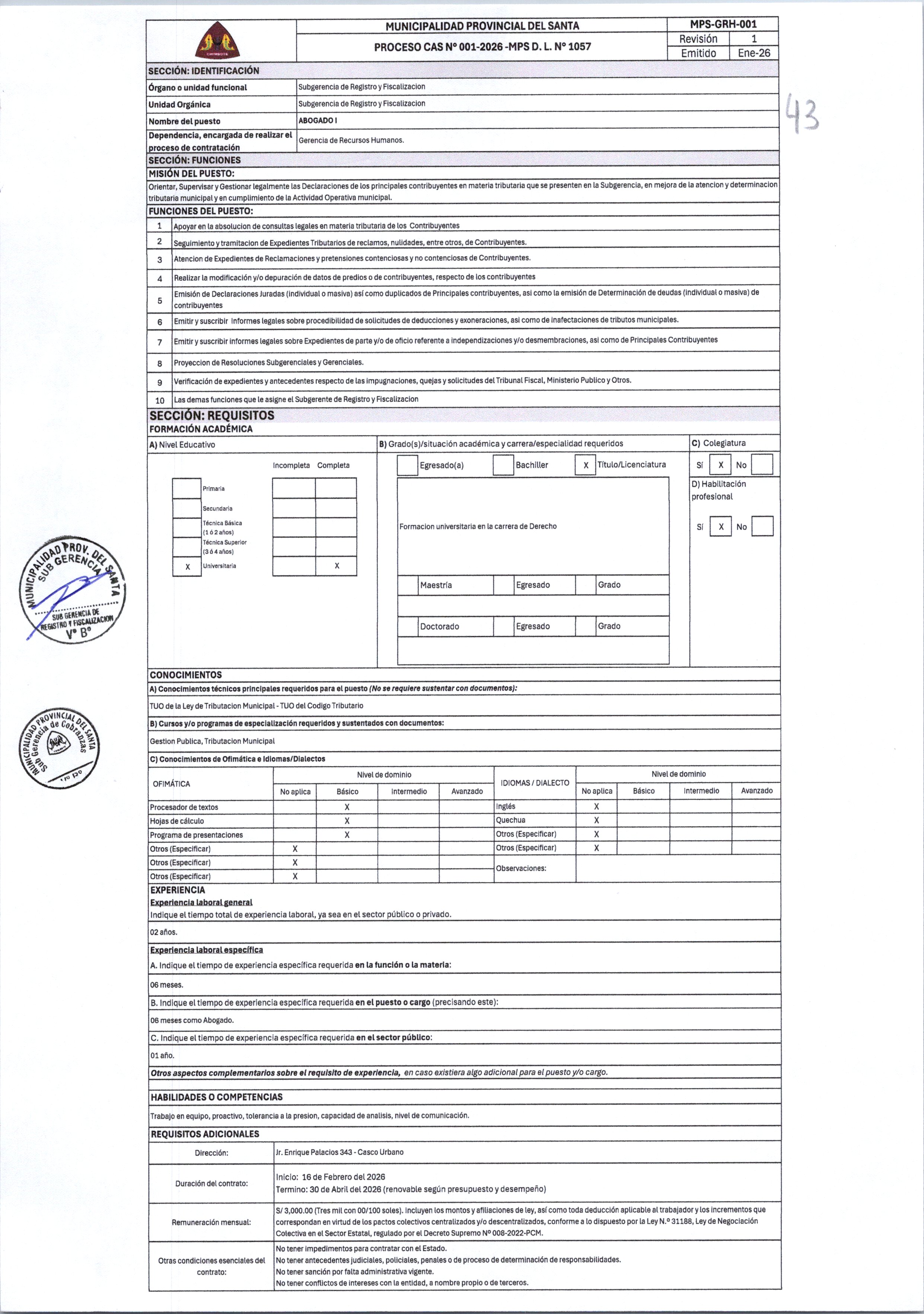 | 43 | PROCESO CAS N° 001-2026-MPS ABOGADO I |