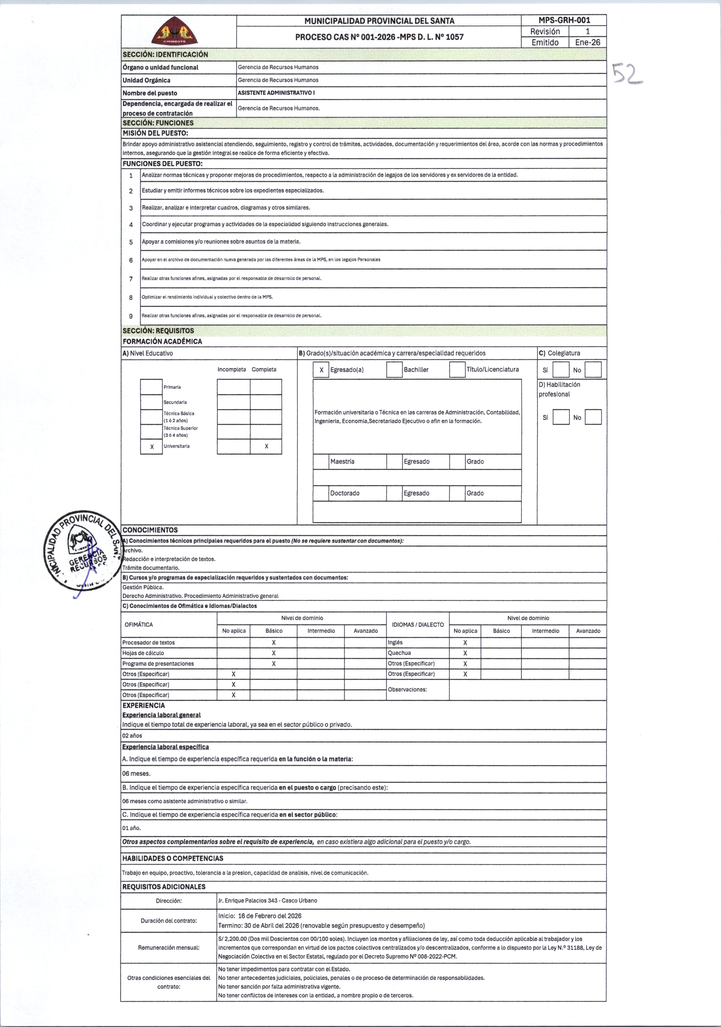 | 52 | PROCESO CAS N° 001-2026-MPS ASISTENTE ADMINISTRATIVO I (DESARROLLO DE PERSONAL) |