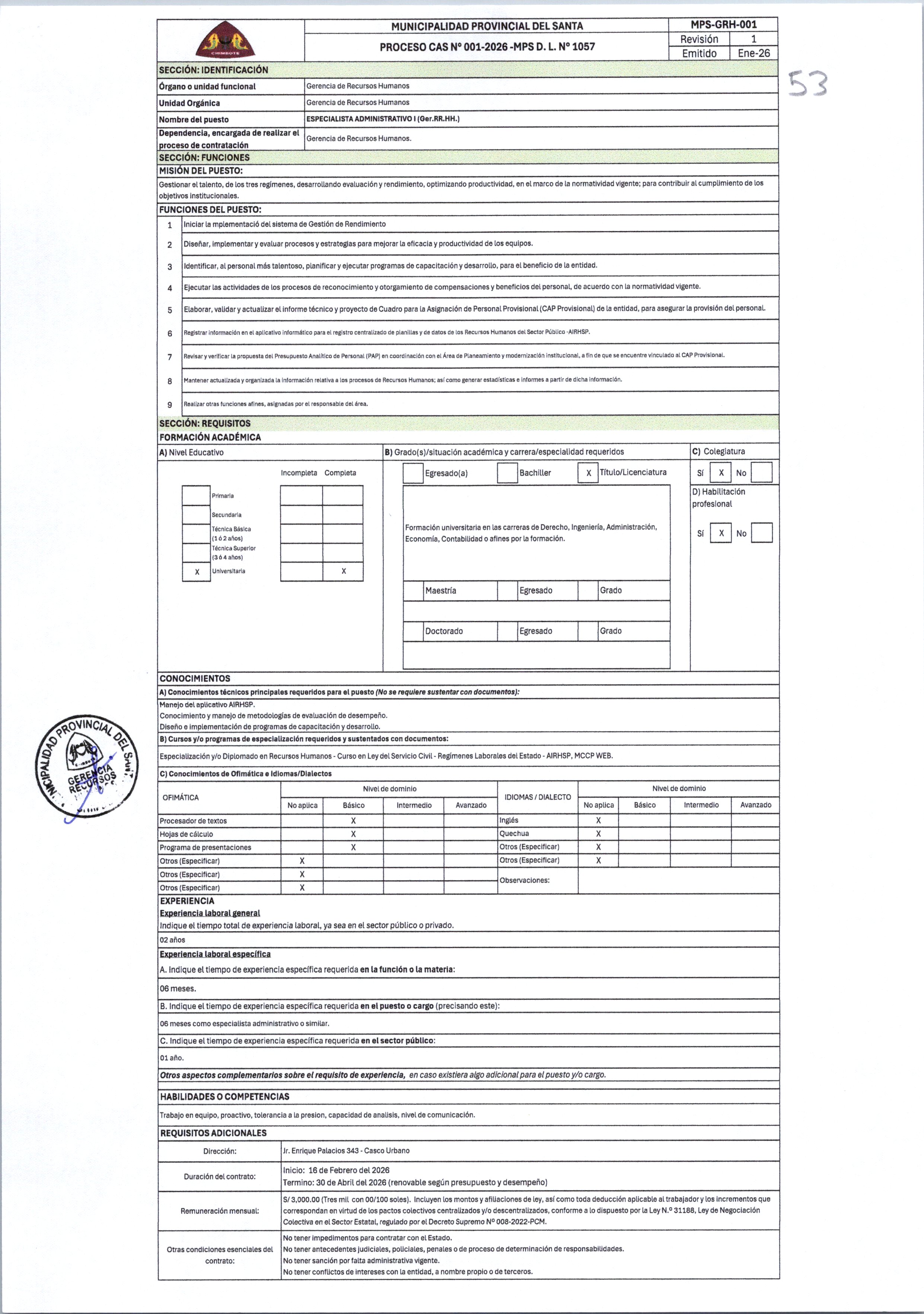 | 53 | PROCESO CAS N° 001-2026-MPS ESPECIALISTA ADMINISTRATIVO I |