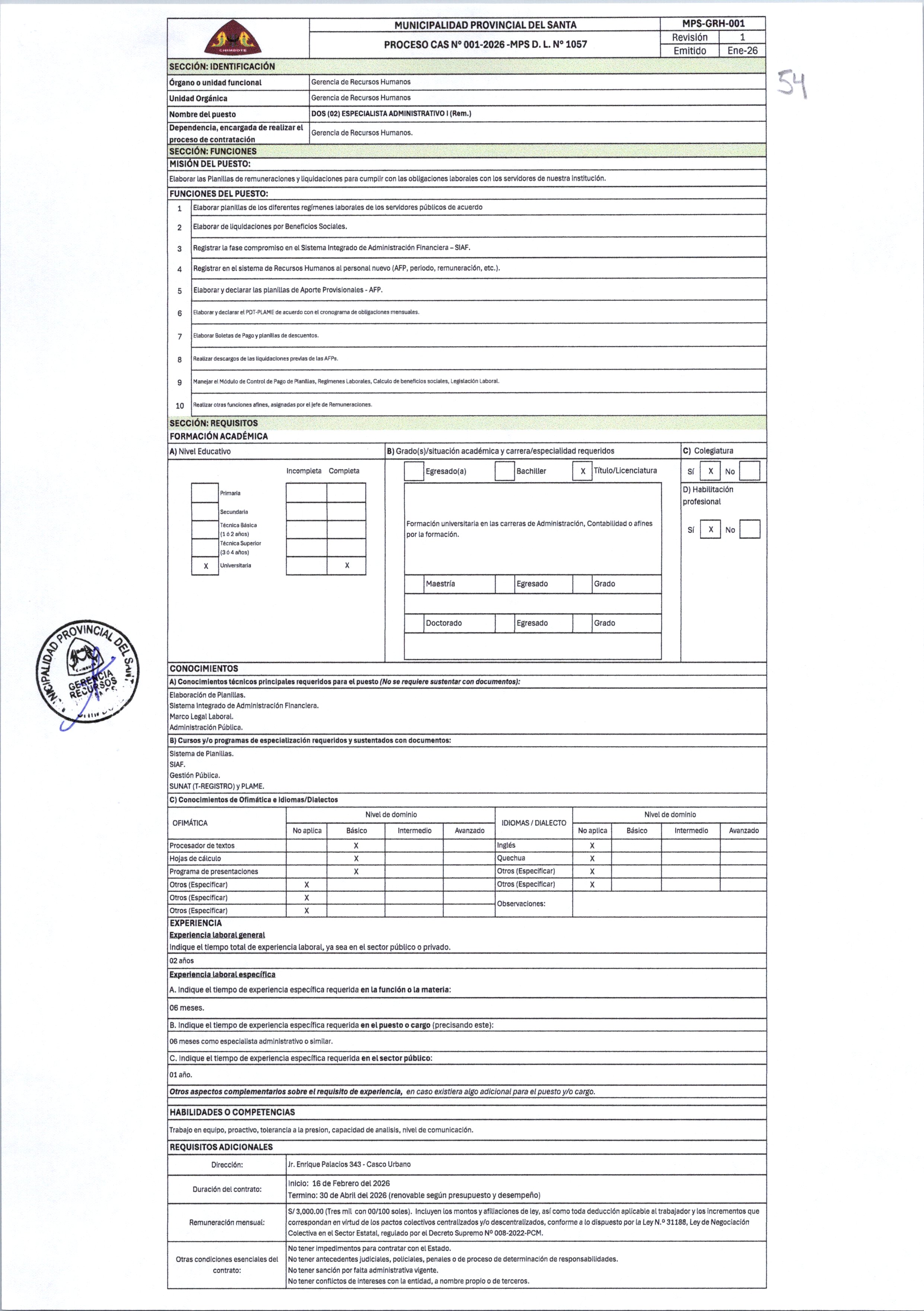 | 54 | PROCESO CAS N° 001-2026-MPS ESPECIALISTA ADMINISTRATIVO I (REMUNERACIONES) |