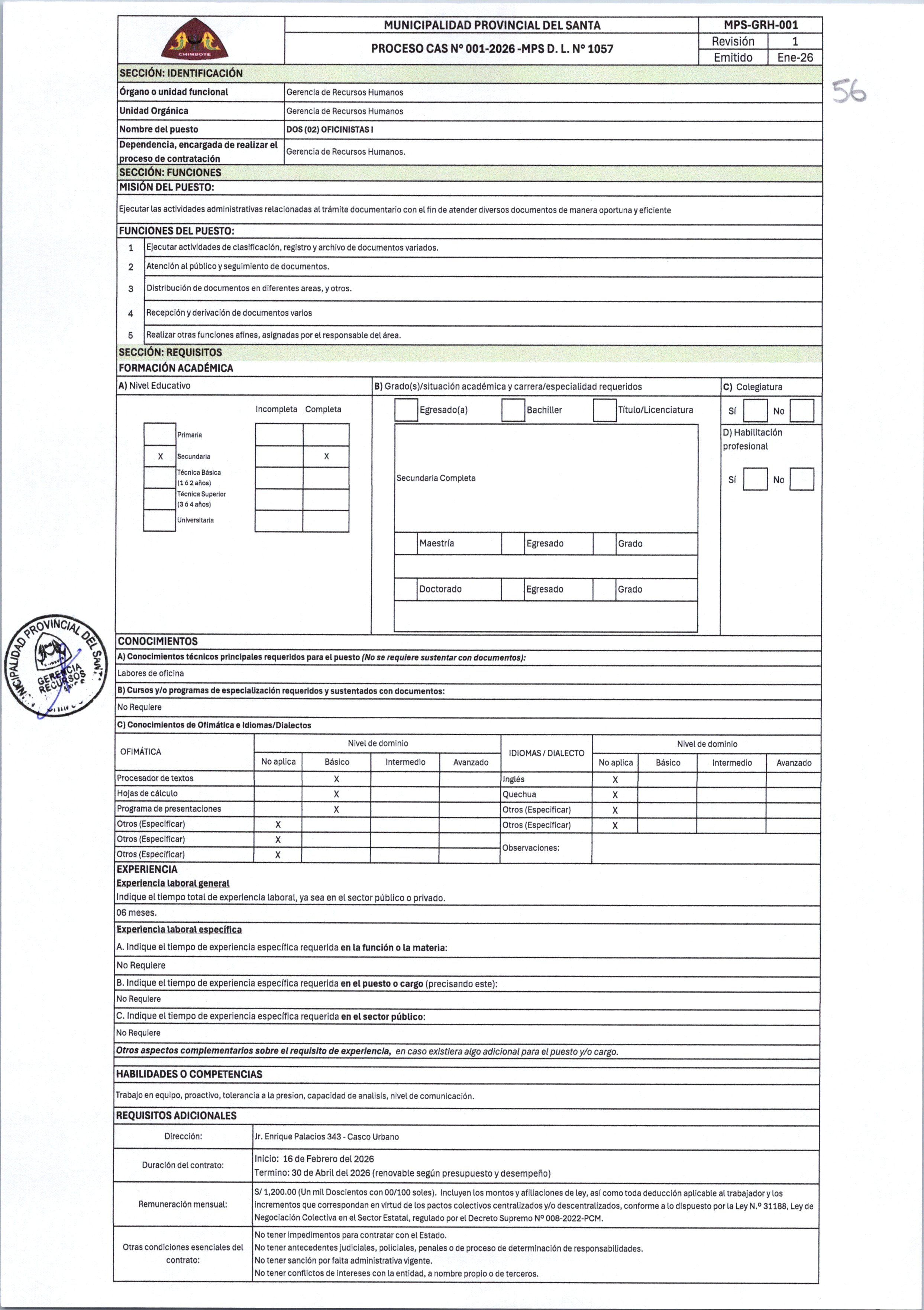 | 56 | PROCESO CAS N° 001-2026-MPS OFICINISTA I |