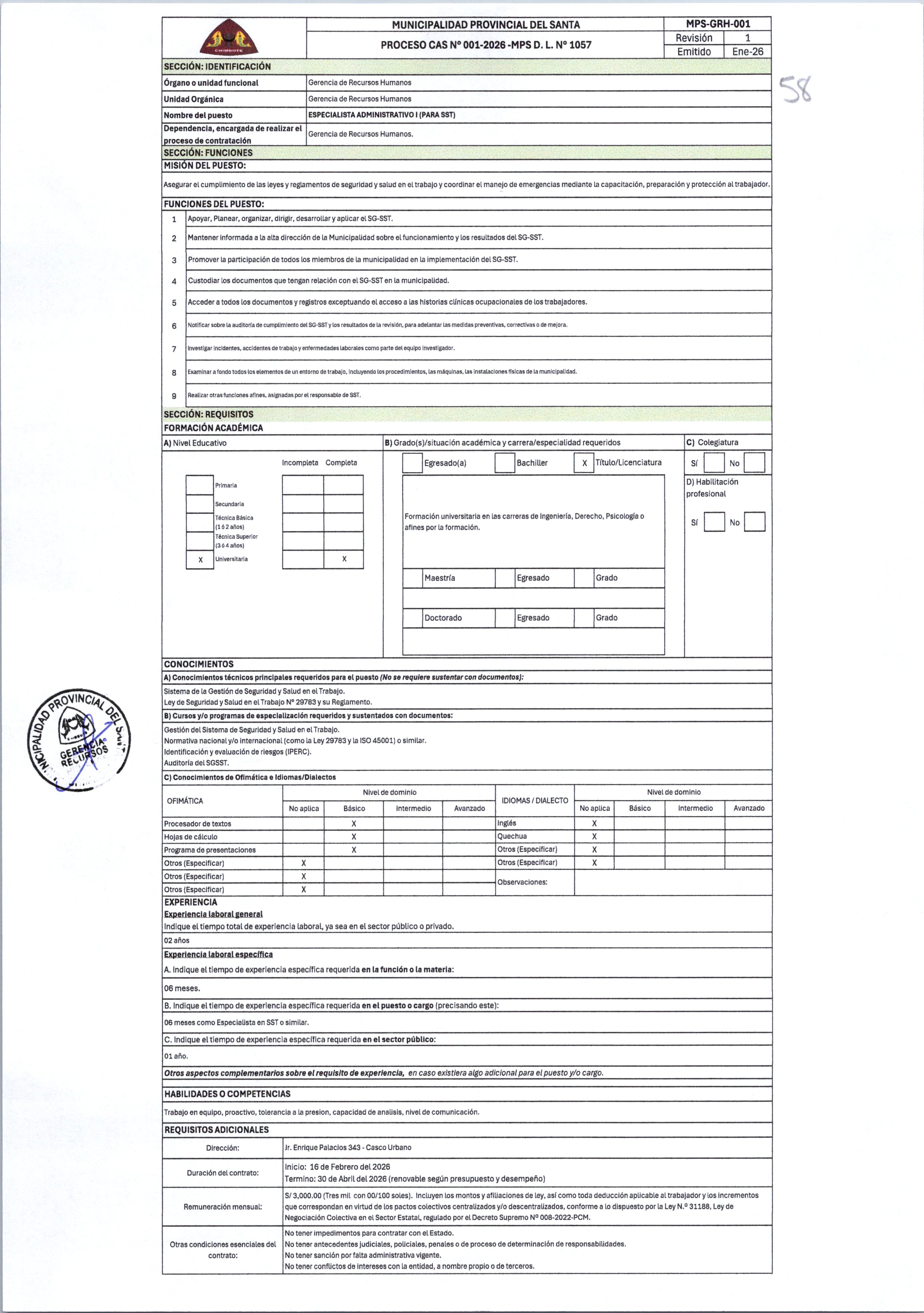 | 58 | PROCESO CAS N° 001-2026-MPS ESPECIALISTA EN SEGURIDAD Y SALUD EN EL TRABAJO |