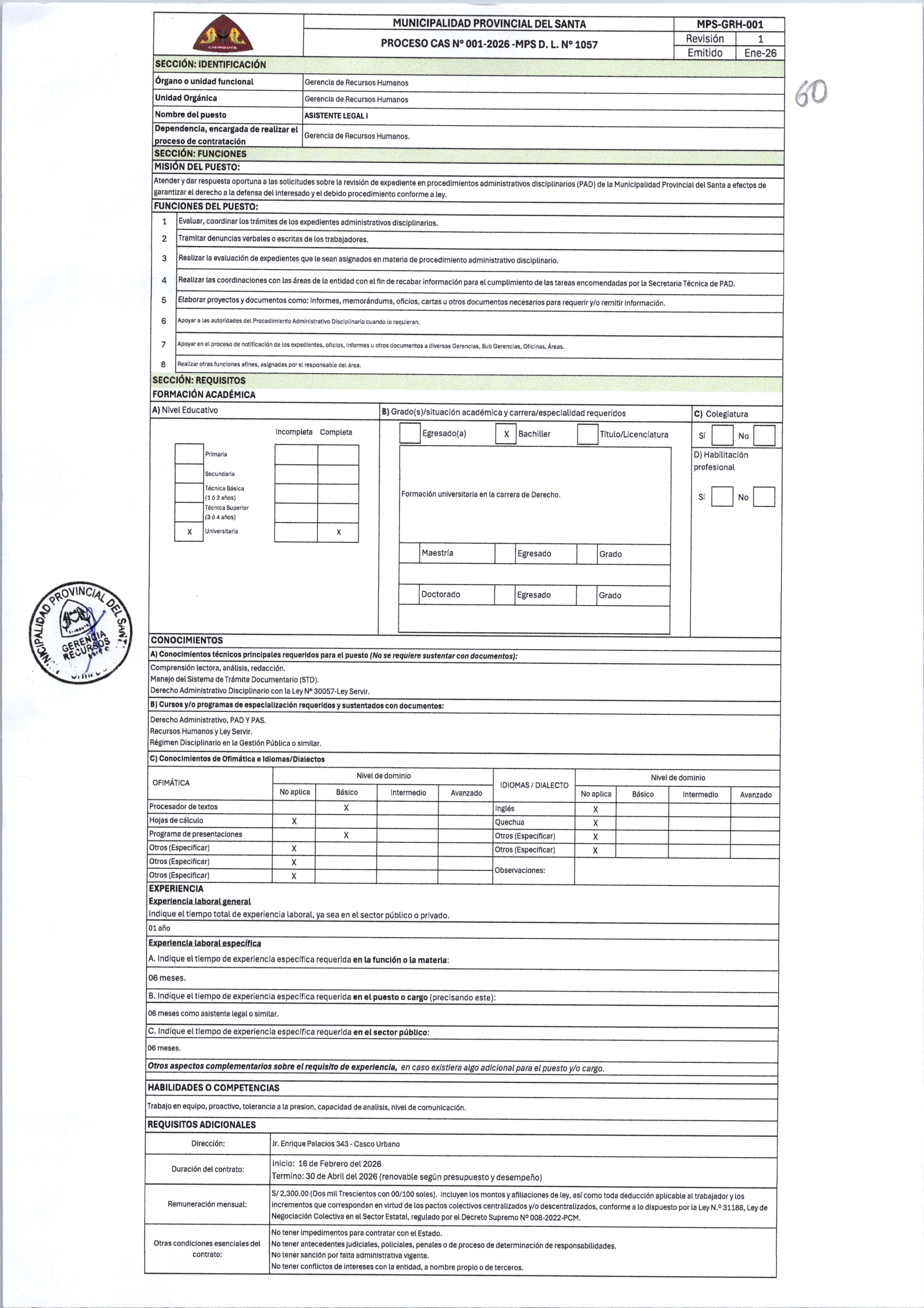| 60 | PROCESO CAS N° 001-2026-MPS ASISTENTE LEGAL I (PAD) |